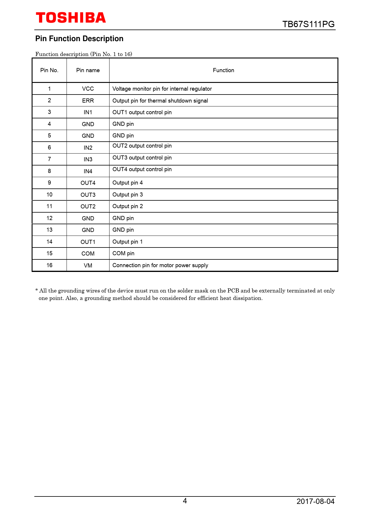 Function description (Pin No. 1 to 16) Pin No. Pin name Function 1 VCC Voltage monitor pin for internal regulator 2 ERR Output pin for thermal shutdown signal 3 IN1 OUT1 output control pin 4 GND GND pin 5 GND GND pin 6 IN2 OUT2 output control pin 7 IN3 OUT3 output control pin 8 IN4 OUT4 output control pin 9 OUT4 Output pin 4 10 OUT3 Output pin 3 11 OUT2 Output pin 2 12 GND GND pin 13 GND GND pin 14 OUT1 Output pin 1 15 COM COM pin 16 VM Connection pin for motor power supply * All the grounding wires of the device must run on the solder mask on the PCB and be externally terminated at only one point. Also, a grounding method should be considered for efficient heat dissipation. 4 2017-08-04