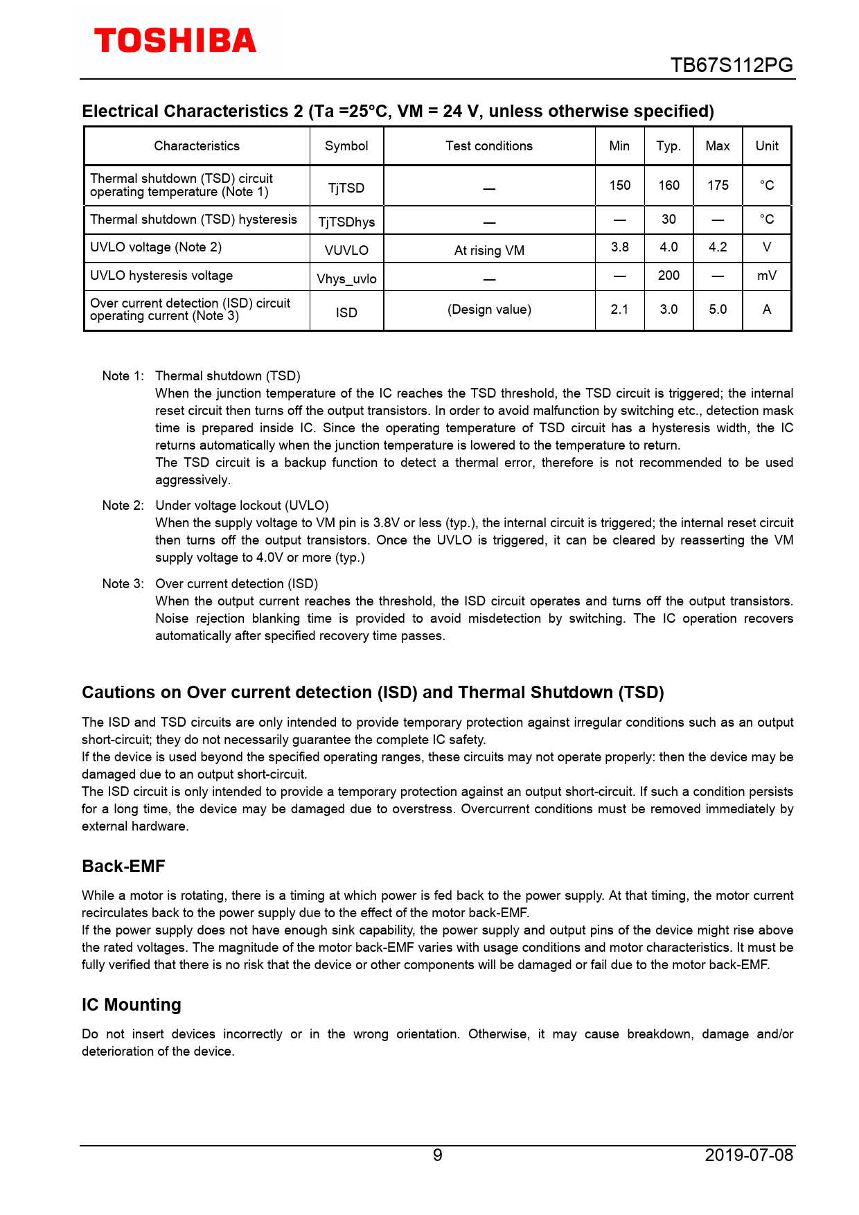 Characteristics Symbol Test conditions Min Typ. Max Unit Thermal shutdown (TSD) circuit operating temperature (Note 1) TjTSD ― 150 160 175 °C Thermal shutdown (TSD) hysteresis TjTSDhys ― ― 30 ― °C UVLO voltage (Note 2) VUVLO At rising VM 3.8 4.0 4.2 V UVLO hysteresis voltage Vhys_uvlo ― ― 200 ― mV Over current detection (ISD) circuit operating current (Note 3) ISD (Design value) 2.1 3.0 5.0 A Note 1: Thermal shutdown (TSD) When the junction temperature of the IC reaches the TSD threshold, the TSD circuit is triggered; the internal reset circuit then turns off the output transistors. In order to avoid malfunction by switching etc., detection mask time is prepared inside IC. Since the operating temperature of TSD circuit has a hysteresis width, the IC returns automatically when the junction temperature is lowered to the temperature to return. The TSD circuit is a backup function to detect a thermal error, therefore is not recommended to be used aggressively. Note 2: Under voltage lockout (UVLO) When the supply voltage to VM pin is 3.8V or less (typ.), the internal circuit is triggered; the internal reset circuit then turns off the output transistors. Once the UVLO is triggered, it can be cleared by reasserting the VM supply voltage to 4.0V or more (typ.) Note 3: Over current detection (ISD) When the output current reaches the threshold, the ISD circuit operates and turns off the output transistors. Noise rejection blanking time is provided to avoid misdetection by switching. The IC operation recovers automatical y after specified recovery time passes.