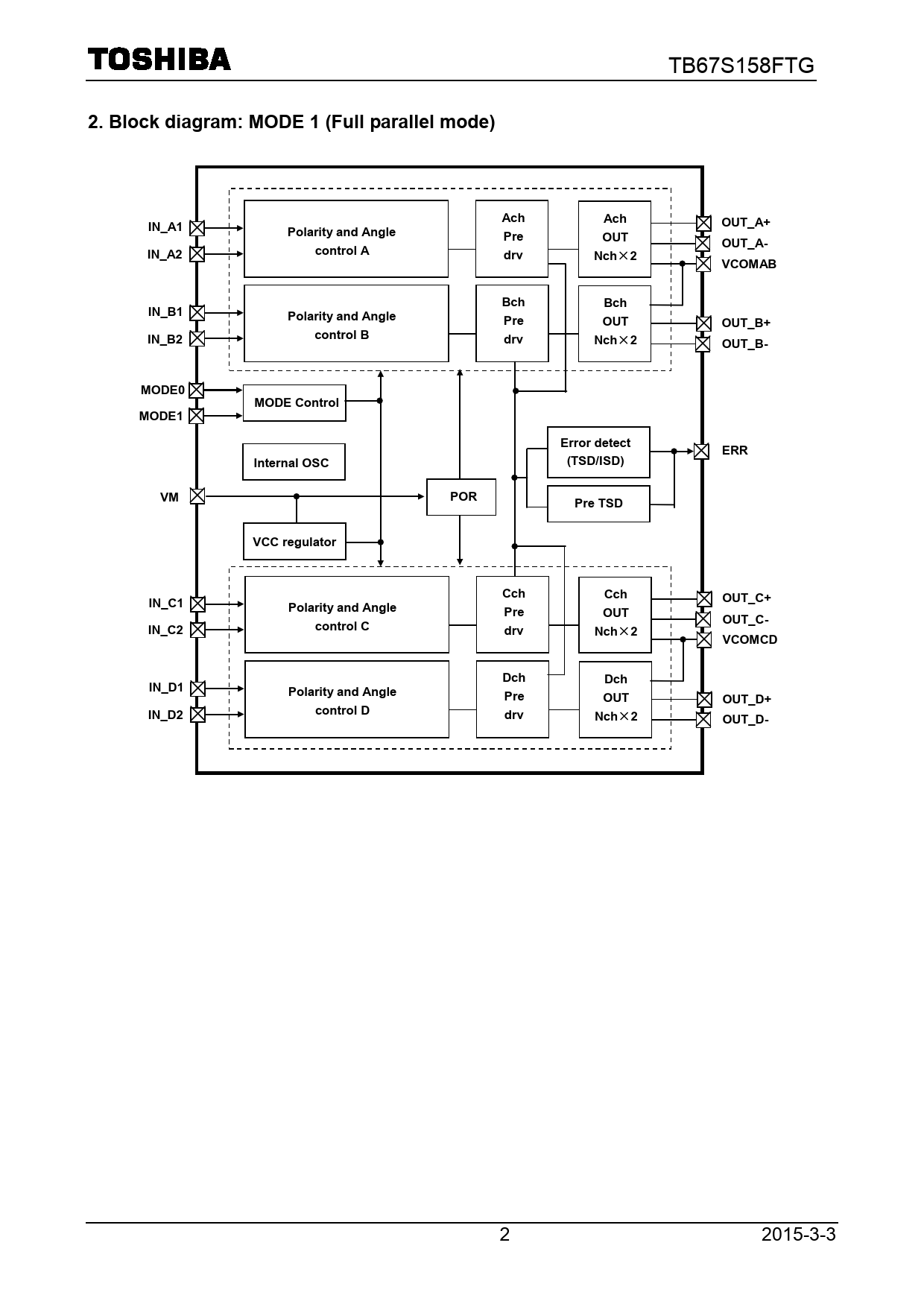 2. Block diagram: MODE 1 (Full parallel mode). Ach. IN_A1. OUT_A+. Polarity and Angle. Pre. OUT. OUT_A-. IN_A2. control A. drv. Nch. VCOMAB. Bch