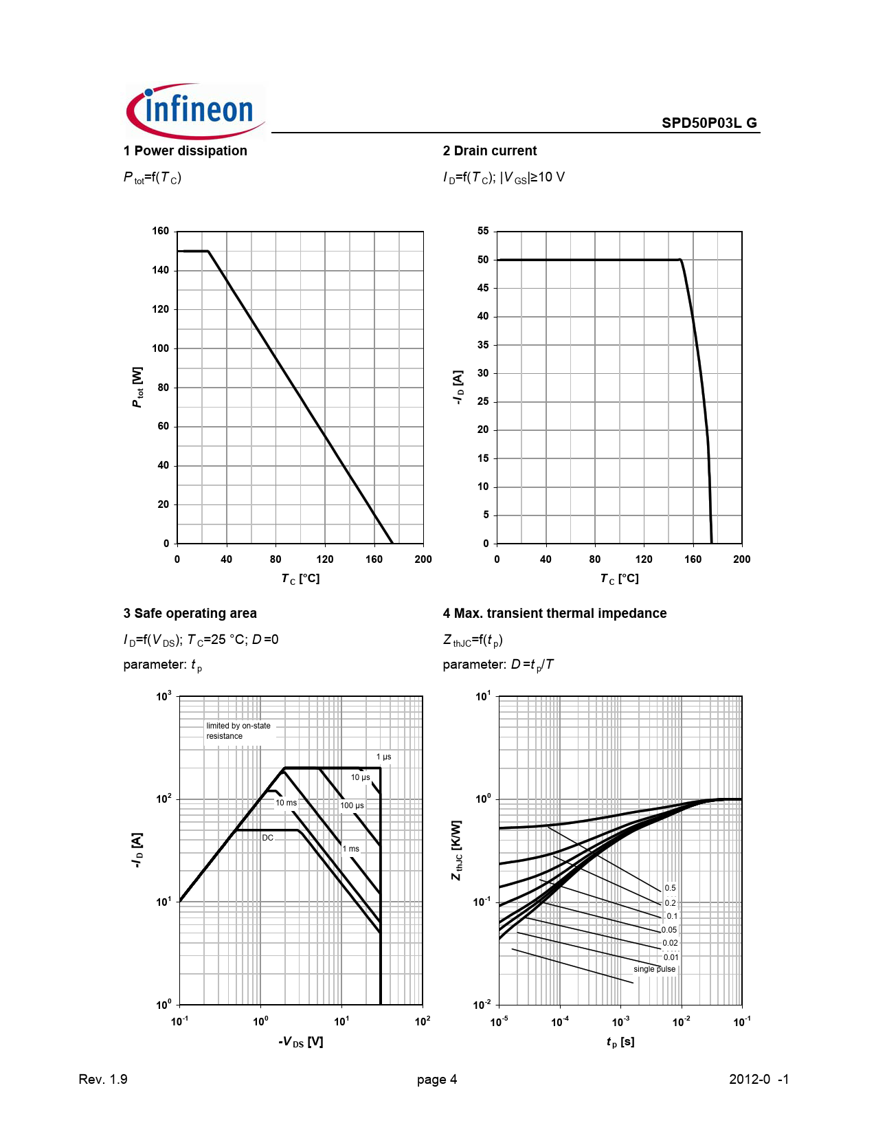 SPD50P03L G. 1 Power dissipation. 2 Drain current. 160. 140. 120. 100. [W]. [A]. tot. 200. C [°C]. 3 Safe operating area