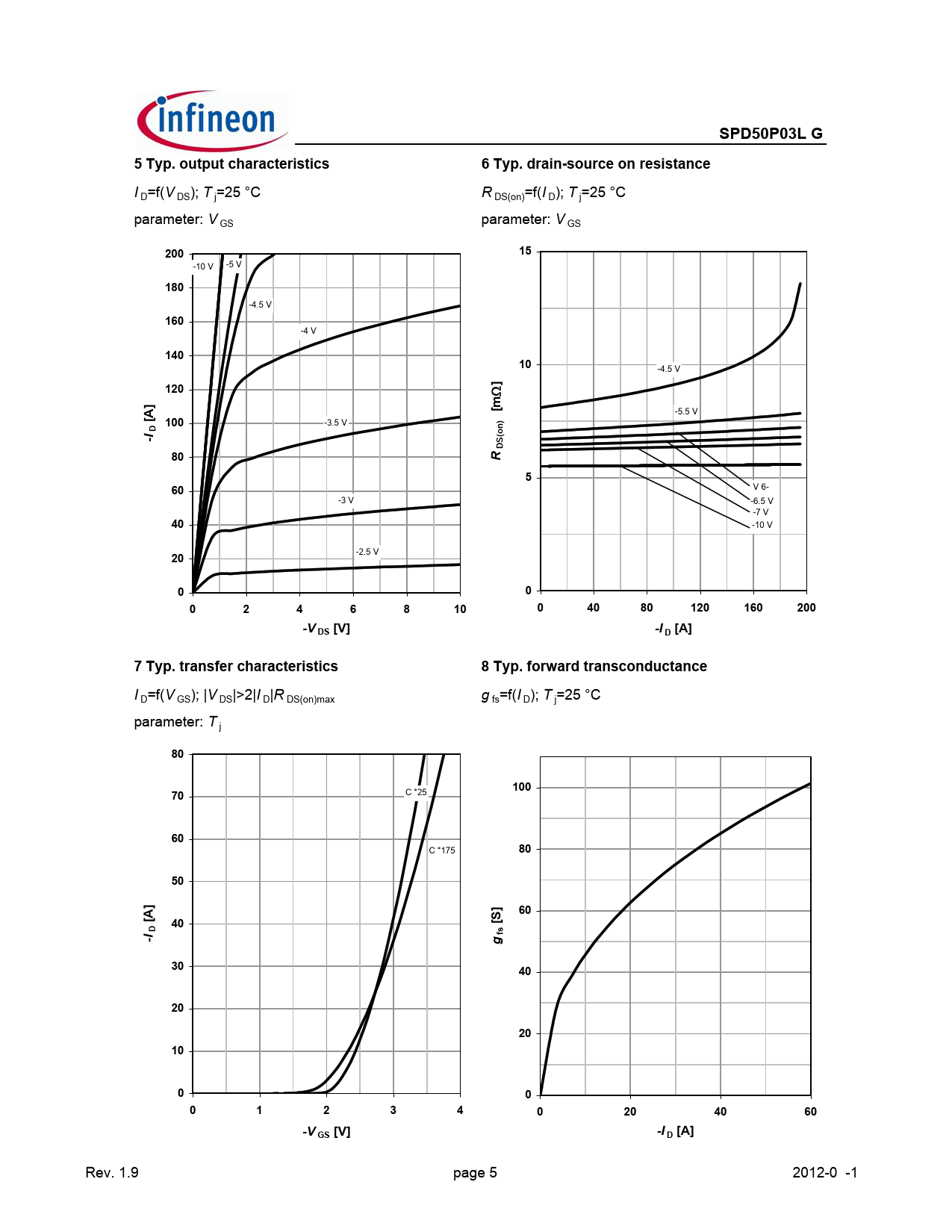 SPD50P03L G 5 Typ output characteristics 6 Typ drain-source on resistance 200 180 160 140 120 [A] 100 (on) DS [V] D [A]