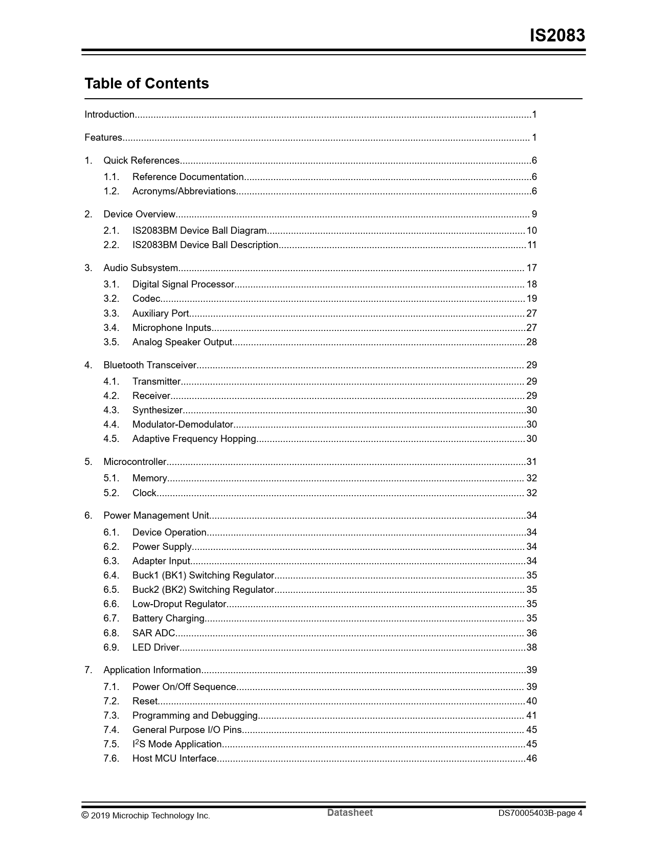 Introduction...1 Features... 1 1. Quick References..6 1.1. Reference Documentation..6 1.2. Acronyms/Abbreviations...6 2. Device Overview... 9 2.1. IS2083BM Device Ball Diagram... 10 2.2. IS2083BM Device Ball Description...11 3. Audio Subsystem.. 17 3.1. Digital Signal Processor... 18 3.2. Codec... 19 3.3. Auxiliary Port.. 27 3.4. Microphone Inputs..27 3.5. Analog Speaker Output.. 28 4. Bluetooth Transceiver... 29 4.1. Transmitter... 29 4.2. Receiver... 29 4.3. Synthesizer...30 4.4. Modulator-Demodulator..30 4.5. Adaptive Frequency Hopping... 30 5. Microcontroller...31 5.1. Memory.. 32 5.2. Clock.. 32 6. Power Management Unit...34 6.1. Device Operation..34 6.2. Power Supply... 34 6.3. Adapter Input..34 6.4. Buck1 (BK1) Switching Regulator.. 35 6.5. Buck2 (BK2) Switching Regulator.. 35 6.6. Low-Droput Regulator.. 35 6.7. Battery Charging.. 35 6.8. SAR ADC... 36 6.9. LED Driver..38 7. Application Information..39 7.1. Power On/Off Sequence.. 39 7.2. Reset.. 40 7.3. Programming and Debugging.. 41 7.4. General Purpose I/O Pins.. 45 7.5. I2S Mode Application..45 7.6. Host MCU Interface..46 © 2019 Microchip Technology Inc.