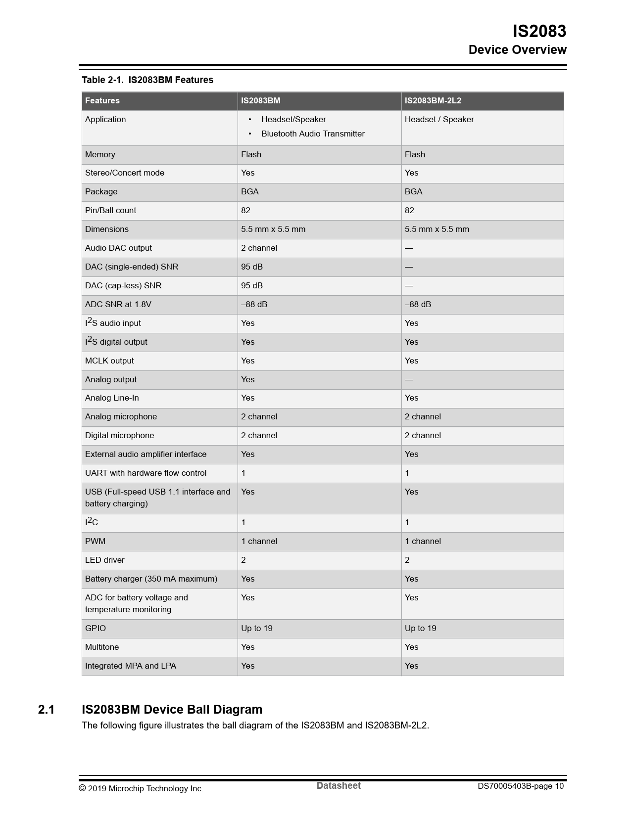 | Seiten / Seite | 65 / 10 — IS2083. Device Overview. Table 2-1. IS2083BM Features. Features. … |
