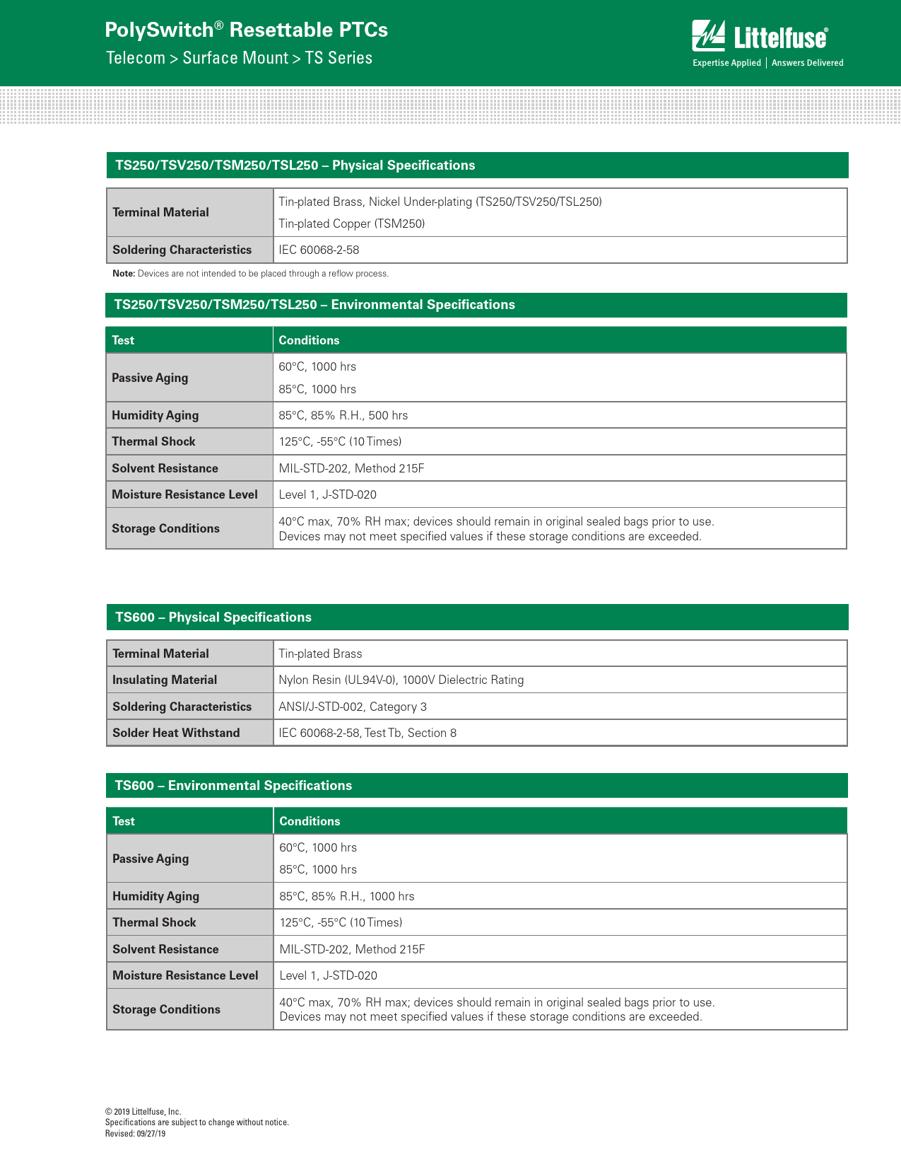 Devices may not meet specified values if these storage conditions are exceeded. © 2019 Littelfuse, Inc. Specifications are subject to change without notice. Revised: 09/27/19