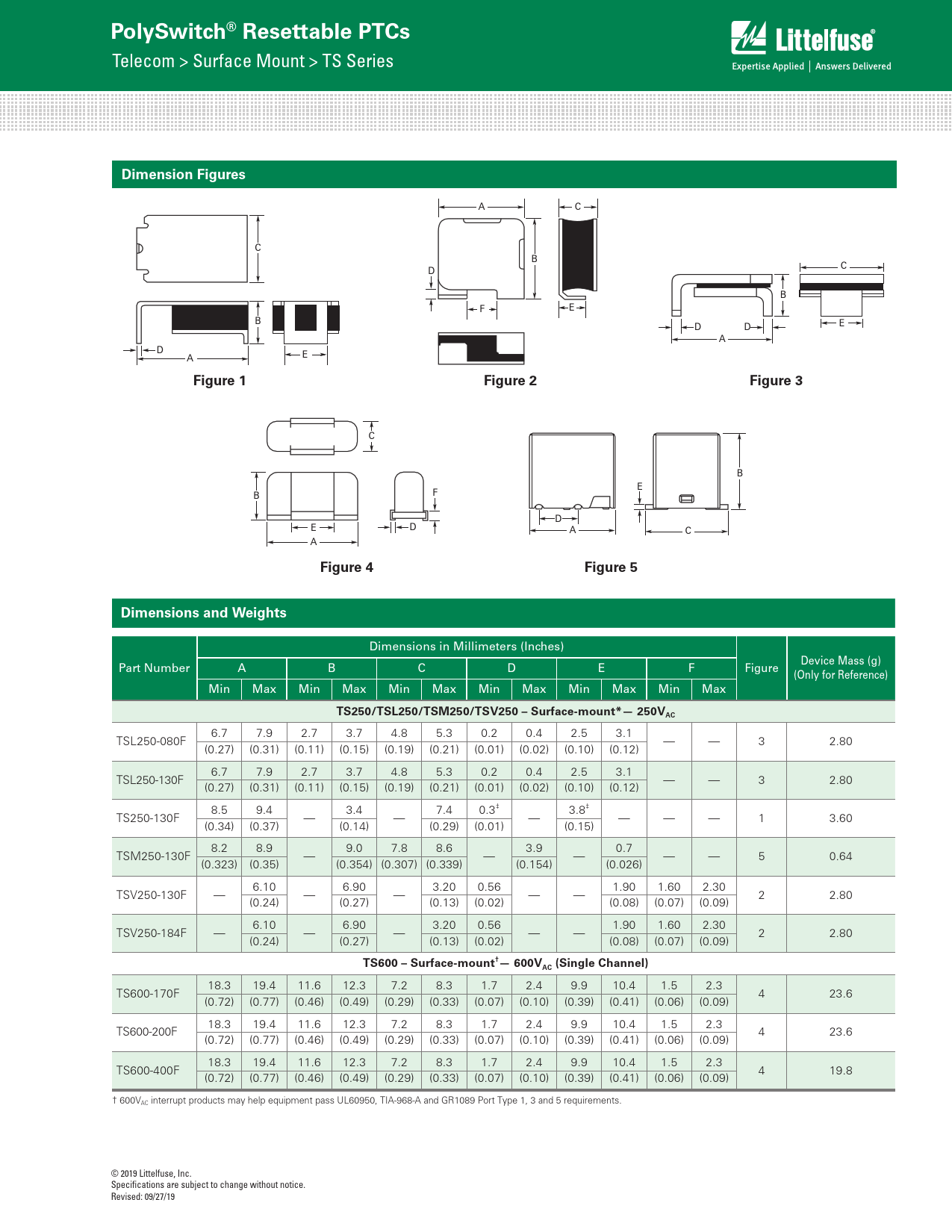 18.3 19.4 11.6 12.3 7.2 8.3 1.7 2.4 9.9 10.4 1.5 2.3 TS600-170F 4 23.6 (0.72) (0.77) (0.46) (0.49) (0.29) (0.33) (0.07) (0.10) (0.39) (0.41) (0.06) (0.09) 18.3 19.4 11.6 12.3 7.2 8.3 1.7 2.4 9.9 10.4 1.5 2.3 TS600-200F 4 23.6 (0.72) (0.77) (0.46) (0.49) (0.29) (0.33) (0.07) (0.10) (0.39) (0.41) (0.06) (0.09) 18.3 19.4 11.6 12.3 7.2 8.3 1.7 2.4 9.9 10.4 1.5 2.3 TS600-400F 4 19.8 (0.72) (0.77) (0.46) (0.49) (0.29) (0.33) (0.07) (0.10) (0.39) (0.41) (0.06) (0.09) † 600VAC interrupt products may help equipment pass UL60950, TIA-968-A and GR1089 Port Type 1, 3 and 5 requirements. © 2019 Littelfuse, Inc. Specifications are subject to change without notice. Revised: 09/27/19