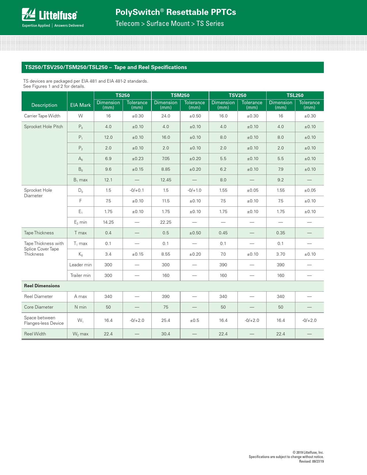 Reel Diameter A max 340 — 390 — 340 — 340 — Core Diameter N min 50 — 75 — 50 — 50 — Space between Flanges-less Device W1 16.4 -0/+2.0 25.4 ±0.5 16.4 -0/+2.0 16.4 -0/+2.0 Reel Width W2 max 22.4 — 30.4 — 22.4 — 22.4 — © 2019 Littelfuse, Inc. Specifications are subject to change without notice. Revised: 09/27/19