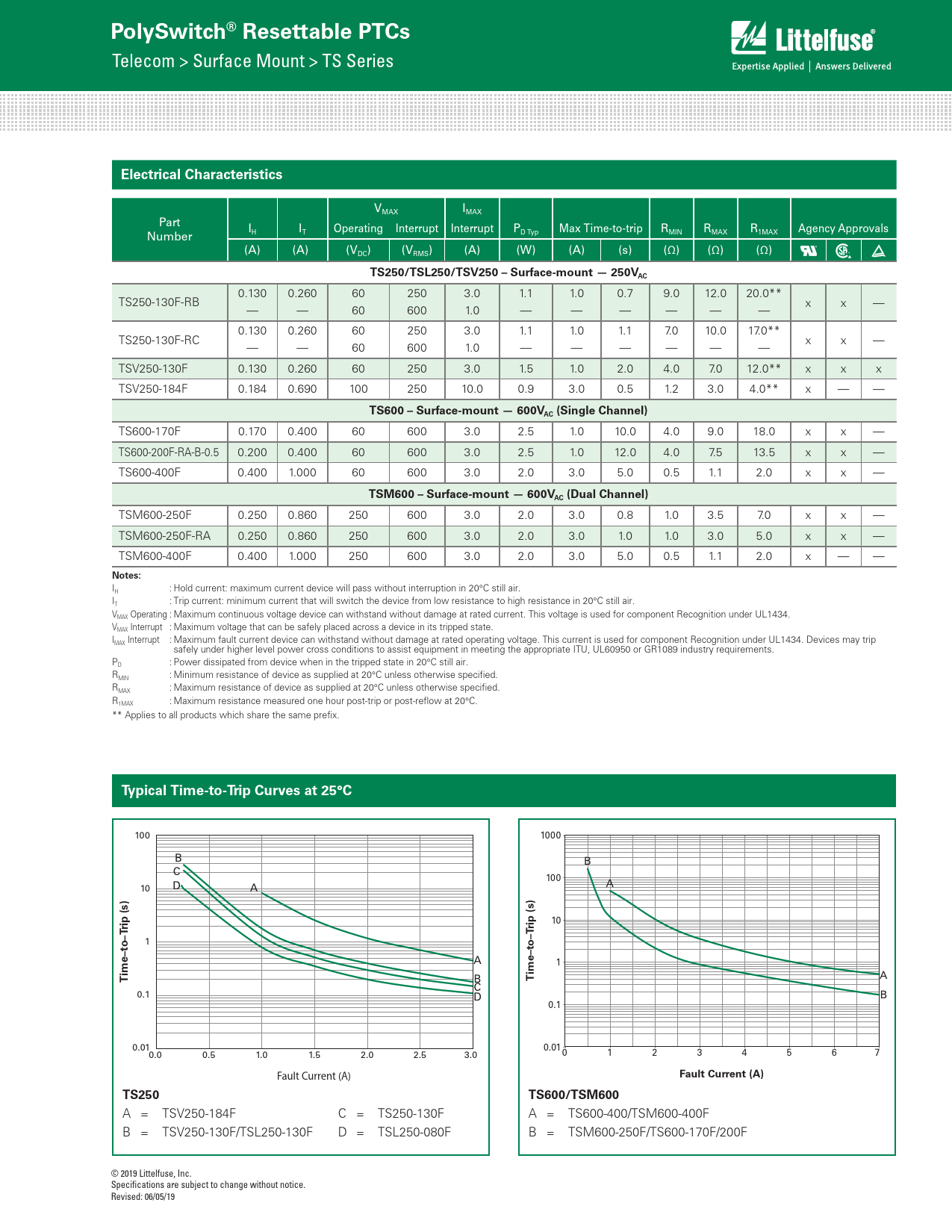 PolySwitch® Resettable PTCs. Electrical Characteristics. TS250/TSL250/TSV250 – Surface-mount — 250VAC