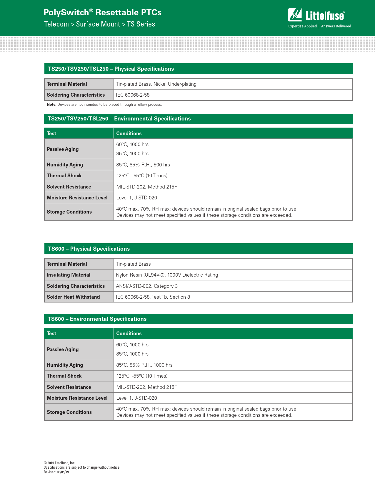 Devices may not meet specified values if these storage conditions are exceeded. © 2019 Littelfuse, Inc. Specifications are subject to change without notice. Revised: 06/05/19