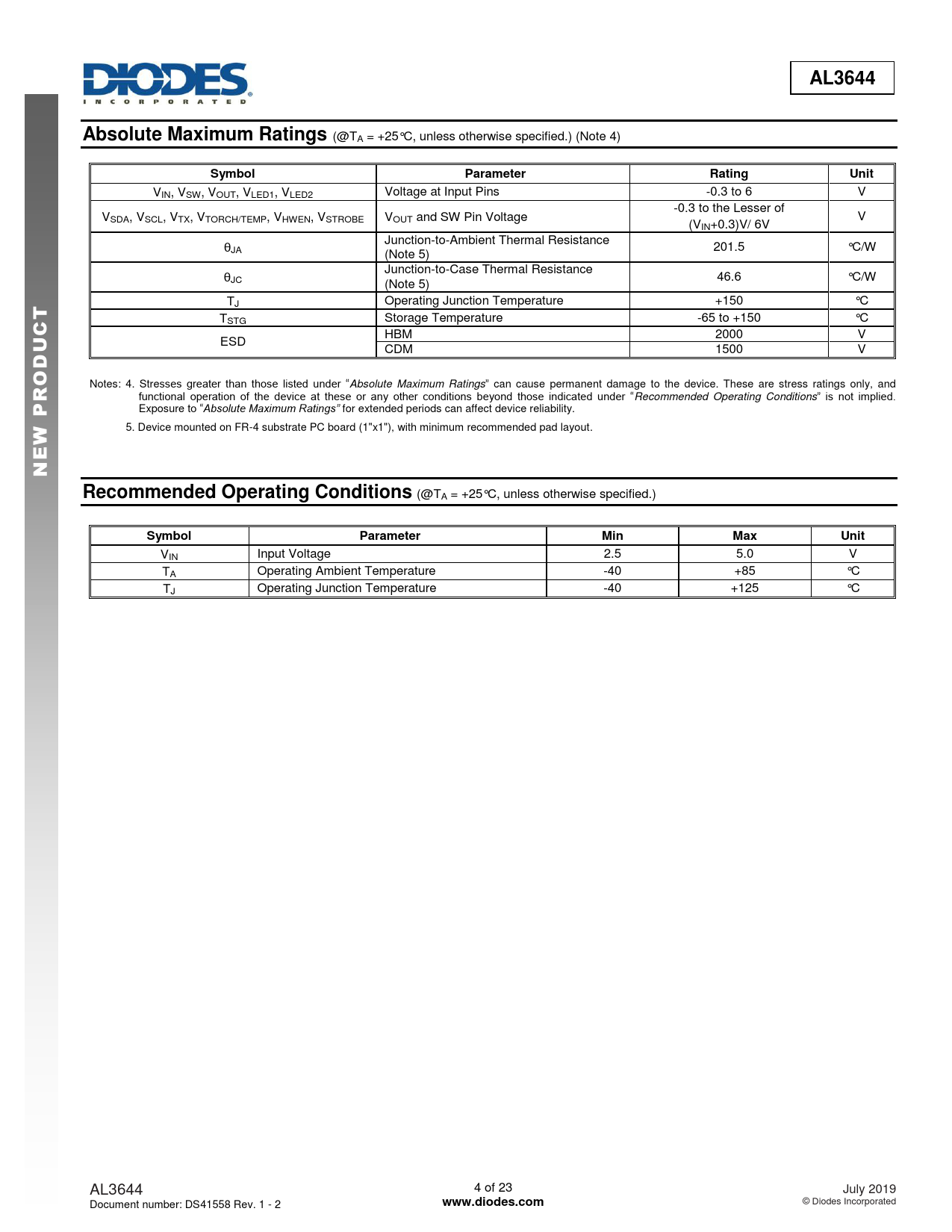 AL3644. Absolute Maximum Ratings. Symbol. Parameter. Rating. Unit. O R. Recommended Operating Conditions. Min. Max. www.diodes.com