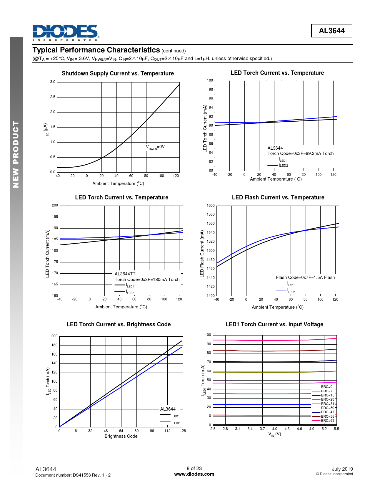 AL3644. Typical Performance Characteristics. Shutdown Supply Current vs. Temperature. LED Torch Current vs. Temperature