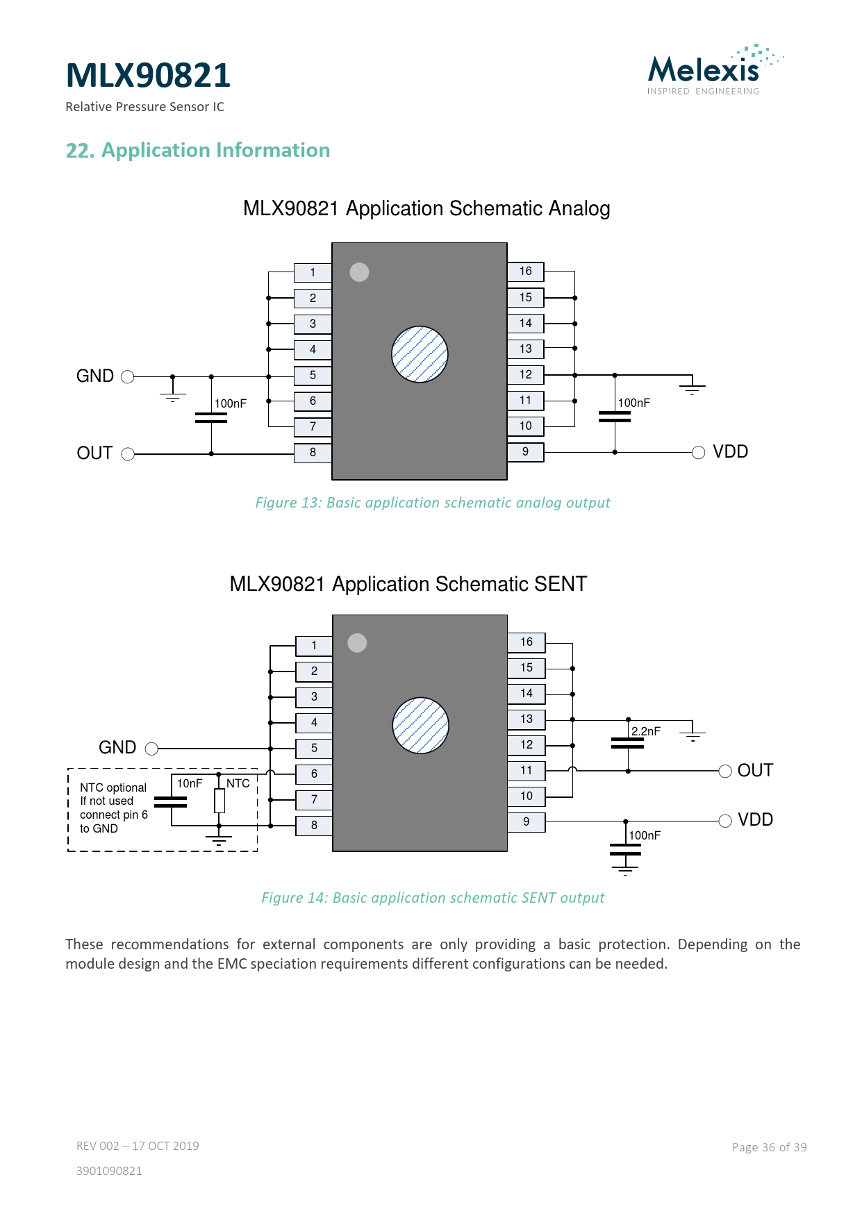 MLX90821 Application Schematic Analog 1 16 2 15 3 14 4 13 5 12 GND 6 11 100nF 100nF 7 10 8 9 OUT VDD Figure 13: Basic application schematic analog output MLX90821 Application Schematic SENT 1 16 2 15 3 14 4 13 2.2nF GND 5 12 6 11 OUT 10nF NTC NTC optional If not used 7 10 connect pin 6 8 9 VDD to GND 100nF Figure 14: Basic application schematic SENT output These recommendations for external components are only providing a basic protection. Depending on the module design and the EMC speciation requirements different configurations can be needed. REV 002 – 17 OCT 2019 Page 36 of 39 3901090821