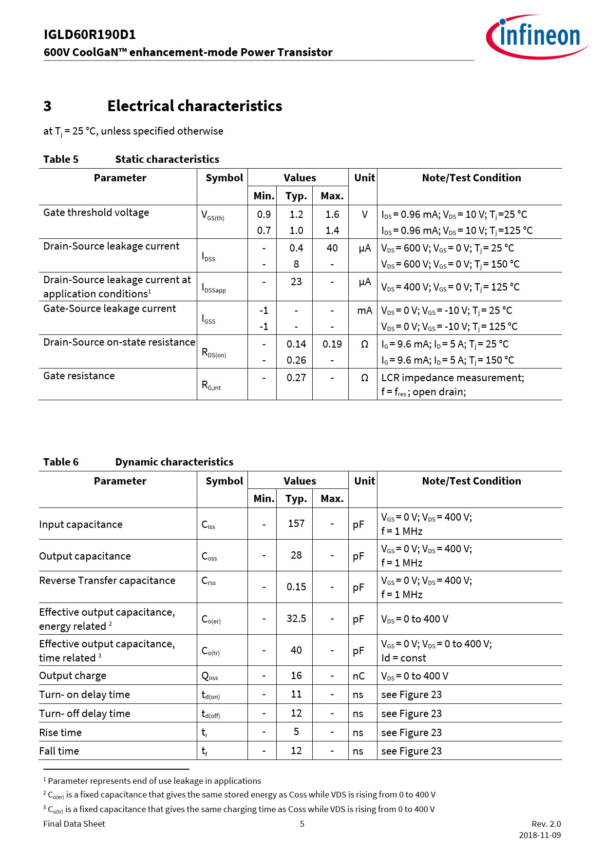 link to page 13 link to page 13 link to page 13 link to page 13 link to page 13 link to page 13 link to page 13 link to page 13 link to page 13 link to page 13 link to page 13 link to page 13 IGLD60R190D1600V CoolGaN™ enhancement-mode Power Transistor3Electrical characteristics at Tj = 25 °C, unless specified otherwise Table 5Static characteristicsParameterSymbolValuesUnitNote/Test ConditionMin. Typ. Max. Gate threshold voltage VGS(th) 0.9 1.2 1.6 V IDS = 0.96 mA; VDS = 10 V; Tj =25 °C 0.7 1.0 1.4 IDS = 0.96 mA; VDS = 10 V; Tj =125 °C Drain-Source leakage current - 0.4 40 µA V I DS = 600 V; VGS = 0 V; Tj = 25 °C DSS - 8 - VDS = 600 V; VGS = 0 V; Tj = 150 °C Drain-Source leakage current at I application conditions1 DSSapp - 23 - μA VDS = 400 V; VGS = 0 V; Tj = 125 °C Gate-Source leakage current -1 - - mA V I DS = 0 V; VGS = -10 V; Tj = 25 °C GSS -1 - - VDS = 0 V; VGS = -10 V; Tj = 125 °C Drain-Source on-state resistance - 0.14 0.19 Ω I R G = 9.6 mA; ID = 5 A; Tj = 25 °C DS(on) - 0.26 - IG = 9.6 mA; ID = 5 A; Tj = 150 °C Gate resistance RG,int - 0.27 - Ω LCR impedance measurement; f = fres ; open drain; Table 6Dynamic characteristicsParameterSymbolValuesUnitNote/Test ConditionMin. Typ. Max. V Input capacitance C GS = 0 V; VDS = 400 V; iss - 157 - pF f = 1 MHz V Output capacitance C GS = 0 V; VDS = 400 V; oss - 28 - pF f = 1 MHz Reverse Transfer capacitance Crss - 0.15 - V pF GS = 0 V; VDS = 400 V; f = 1 MHz Effective output capacitance, C energy related 2 o(er) - 32.5 - pF VDS = 0 to 400 V Effective output capacitance, V C GS = 0 V; VDS = 0 to 400 V; time related 3 o(tr) - 40 - pF Id = const Output charge Qoss - 16 - nC VDS = 0 to 400 V Turn- on delay time td(on) - 11 - ns see Figure 23 Turn- off delay time td(off) - 12 - ns see Figure 23 Rise time tr - 5 - ns see Figure 23 Fall time tf - 12 - ns see Figure 23 1 Parameter represents end of use leakage in applications 2 Co(er) is a fixed capacitance that gives the same stored energy as Coss while VDS is rising from 0 to 400 V 3 Co(tr) is a fixed capacitance that gives the same charging time as Coss while VDS is rising from 0 to 400 V Final Data Sheet 5 Rev. 2.0 2018-11-09 Document Outline Features Benefits Applications Table of Contents 1 Maximum ratings 2 Thermal characteristics 3 Electrical characteristics 4 Electrical characteristics diagrams 5 Test Circuits 6 Package Outlines 7 Appendix A 8 Revision History