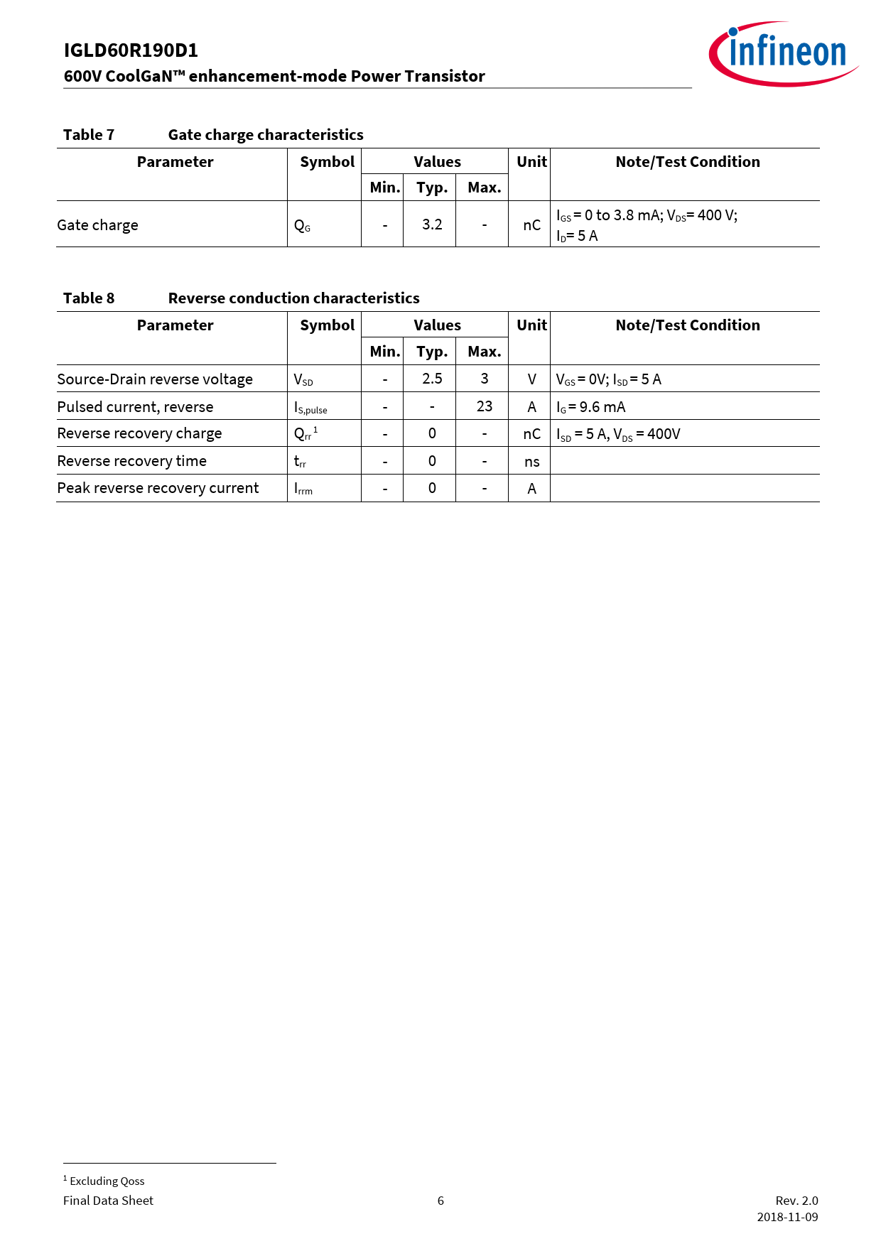 IGL. D60R190D1. 600V CoolGaN™ enhancement-mode Power Transistor. Table 7. Gate charge characteristics. Parameter. Symbol. Values. Unit
