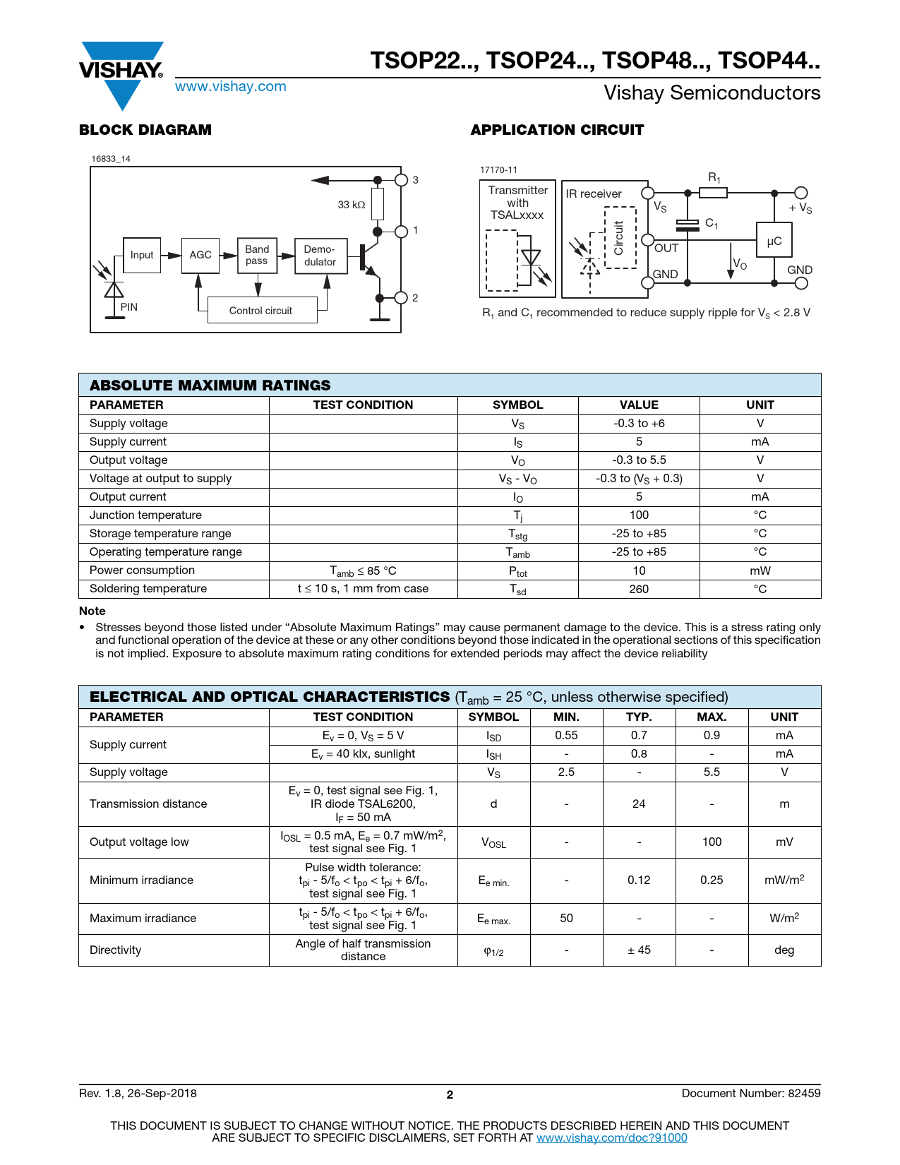 TSOP22.., TSOP24.., TSOP48.., TSOP44.. www.vishay.com Vishay Semiconductors BLOCK DIAGRAMAPPLICATION CIRCUIT 16833_14 17170-11 3 R1 Transmitter IR receiver 33 kΩ with VS + VS TSALxxxx C 1 1 μC Band Demo- OUT Input AGC Circuit pass dulator VO GND GND 2 PIN Control circuit R and C recommended to reduce supply ripple for V < 2.8 V 1 1 S ABSOLUTE MAXIMUM RATINGS PARAMETERTEST CONDITIONSYMBOLVALUEUNIT Supply voltage VS -0.3 to +6 V Supply current IS 5 mA Output voltage VO -0.3 to 5.5 V Voltage at output to supply VS - VO -0.3 to (VS + 0.3) V Output current IO 5 mA Junction temperature Tj 100 °C Storage temperature range Tstg -25 to +85 °C Operating temperature range Tamb -25 to +85 °C Power consumption Tamb ≤ 85 °C Ptot 10 mW Soldering temperature t ≤ 10 s, 1 mm from case Tsd 260 °C Note • Stresses beyond those listed under “Absolute Maximum Ratings” may cause permanent damage to the device. This is a stress rating only and functional operation of the device at these or any other conditions beyond those indicated in the operational sections of this specification is not implied. Exposure to absolute maximum rating conditions for extended periods may affect the device reliability ELECTRICAL AND OPTICAL CHARACTERISTICS (Tamb = 25 °C, unless otherwise specified) PARAMETERTEST CONDITIONSYMBOLMIN.TYP.MAX.UNIT Ev = 0, VS = 5 V ISD 0.55 0.7 0.9 mA Supply current Ev = 40 klx, sunlight ISH - 0.8 - mA Supply voltage VS 2.5 - 5.5 V Ev = 0, test signal see Fig. 1, Transmission distance IR diode TSAL6200, d - 24 - m IF = 50 mA I Output voltage low OSL = 0.5 mA, Ee = 0.7 mW/m2, V test signal see Fig. 1 OSL - - 100 mV Pulse width tolerance: Minimum irradiance tpi - 5/fo < tpo < tpi + 6/fo, Ee min. - 0.12 0.25 mW/m2 test signal see Fig. 1 t Maximum irradiance pi - 5/fo < tpo < tpi + 6/fo, E test signal see Fig. 1 e max. 50 - - W/m2 Angle of half transmission Directivity ϕ 45 - deg distance 1/2 - ± Rev. 1.8, 26-Sep-2018 2 Document Number: 82459 THIS DOCUMENT IS SUBJECT TO CHANGE WITHOUT NOTICE. THE PRODUCTS DESCRIBED HEREIN AND THIS DOCUMENT ARE SUBJECT TO SPECIFIC DISCLAIMERS, SET FORTH AT www.vishay.com/doc?91000