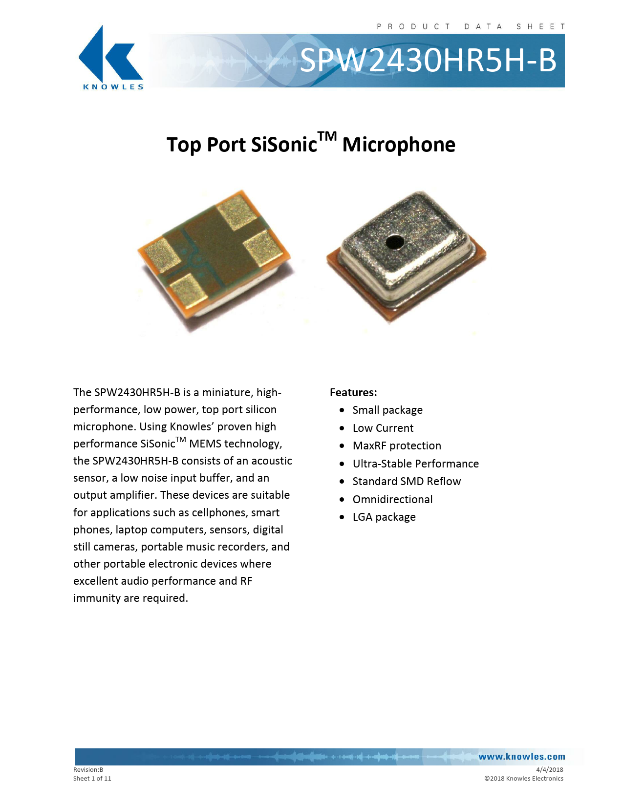| Seiten / Seite | 11 / 1 — Top Port SiSonicTM Microphone. Features: |