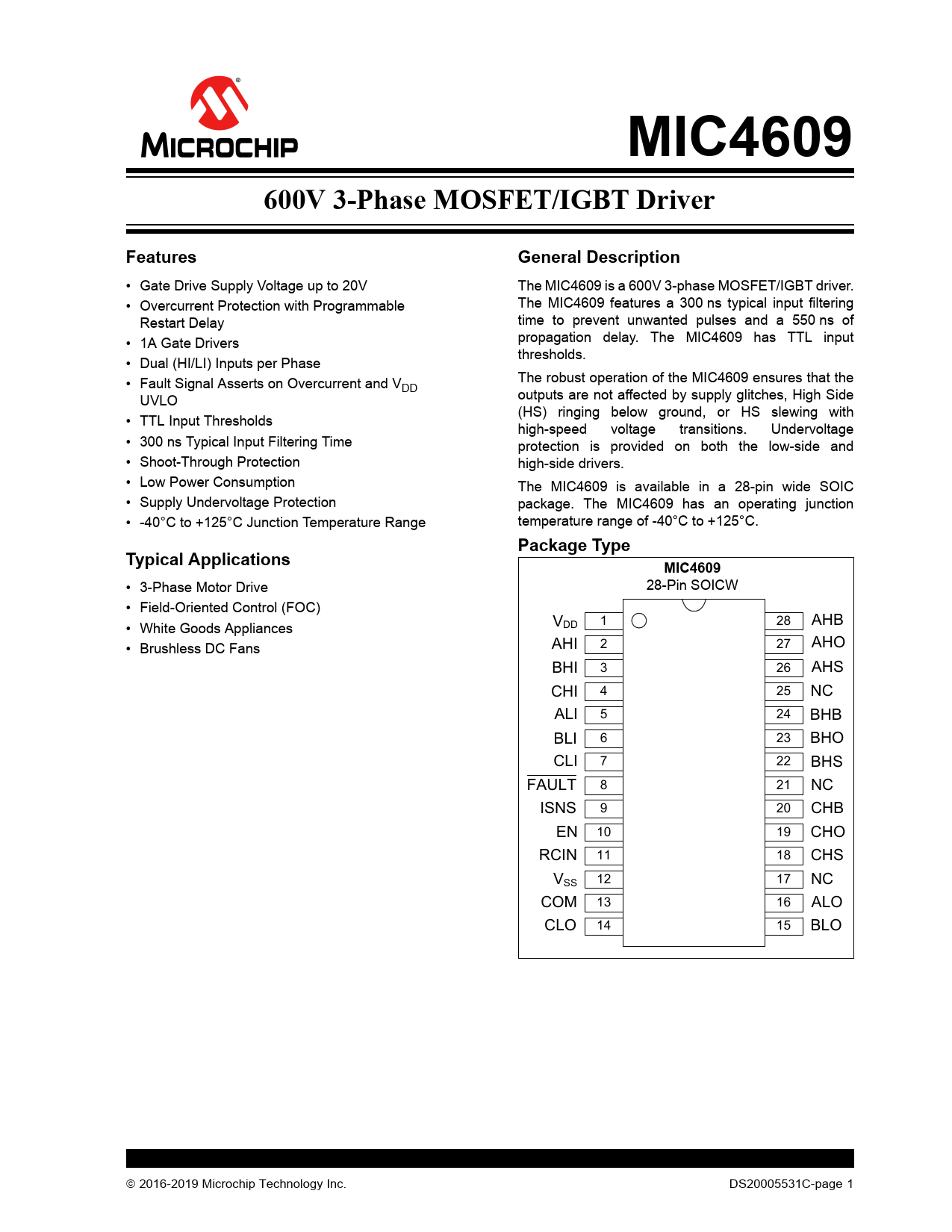MIC4609600V 3-Phase MOSFET/IGBT DriverFeaturesGeneral Description • Gate Drive Supply Voltage up to 20V The MIC4609 is a 600V 3-phase MOSFET/IGBT driver. • Overcurrent Protection with Programmable The MIC4609 features a 300 ns typical input filtering Restart Delay time to prevent unwanted pulses and a 550 ns of • 1A Gate Drivers propagation delay. The MIC4609 has TTL input thresholds. • Dual (HI/LI) Inputs per Phase • Fault Signal Asserts on Overcurrent and V The robust operation of the MIC4609 ensures that the DD UVLO outputs are not affected by supply glitches, High Side (HS) ringing below ground, or HS slewing with • TTL Input Thresholds high-speed voltage transitions. Undervoltage • 300 ns Typical Input Filtering Time protection is provided on both the low-side and • Shoot-Through Protection high-side drivers. • Low Power Consumption The MIC4609 is available in a 28-pin wide SOIC • Supply Undervoltage Protection package. The MIC4609 has an operating junction • -40°C to +125°C Junction Temperature Range temperature range of -40°C to +125°C. Package TypeTypical ApplicationsMIC4609 • 3-Phase Motor Drive 28-Pin SOICW • Field-Oriented Control (FOC) • White Goods Appliances V 1 28 AHB DD • Brushless DC Fans AHI 2 27 AHO BHI 3 26 AHS CHI 4 25 NC ALI 5 24 BHB BLI 6 23 BHO CLI 7 22 BHS FAULT 8 21 NC ISNS 9 20 CHB EN 10 19 CHO RCIN 11 18 CHS VSS 12 17 NC COM 13 16 ALO CLO 14 15 BLO 2016-2019 Microchip Technology Inc. DS20005531C-page 1 Document Outline 600V 3-Phase MOSFET/IGBT Driver Features Typical Applications General Description Package Type Functional Block Diagram MIC4609 – Top Level Circuit Functional Block Diagram MIC4609 – Phase x Drive Circuit Typical Application Circuit MIC4609 – 300V, 3-Phase Motor Driver 1.0 Electrical Characteristics Absolute Maximum Ratings Operating Ratings AC/DC Electrical Characteristics Temperature Characteristics 2.0 Typical Performance Curves FIGURE 2-1: VDD Quiescent Current vs. VDD Voltage. FIGURE 2-2: VDD Quiescent Current vs. Temperature. FIGURE 2-3: VHB Quiescent Current vs. VHB Voltage. FIGURE 2-4: VHB Quiescent Current vs. Temperature. FIGURE 2-5: VDD+HB Shutdown Current vs. Voltage. FIGURE 2-6: VDD+HB Shutdown Current vs. Temperature. FIGURE 2-7: VDD+HB Shutdown Current vs. Voltage. FIGURE 2-8: VDD+HB Shutdown Current vs. Temperature. FIGURE 2-9: VDD Operating Current vs. Frequency. FIGURE 2-10: VHB Operating Current vs. Frequency – One Phase. FIGURE 2-11: HO Output Sink ON-Resistance vs. VDD. FIGURE 2-12: HO Output Sink ON-Resistance vs. Temperature. FIGURE 2-13: LO Output Sink ON-Resistance vs. VDD. FIGURE 2-14: LO Output Sink ON-Resistance vs. Temperature. FIGURE 2-15: HO Output Source ON-Resistance vs. VDD. FIGURE 2-16: HO Output Source ON-Resistance vs. Temperature. FIGURE 2-17: LO Output Source ON-Resistance vs. VDD. FIGURE 2-18: LO Output Source ON-Resistance vs. Temperature. FIGURE 2-19: VDD/VHB ULVO vs. Temperature. FIGURE 2-20: Propagation Delay vs. VDD Voltage. FIGURE 2-21: Propagation Delay vs. Temperature. FIGURE 2-22: HO Rise Time vs. VDD Voltage. FIGURE 2-23: HO Fall Time vs. VDD Voltage. FIGURE 2-24: LO Rise Time vs. VDD Voltage. FIGURE 2-25: LO Fall Time vs. VDD Voltage. FIGURE 2-26: Rise/Fall Time vs. Temperature (VDD = 10V). FIGURE 2-27: Rise/Fall Time vs. Temperature (VDD = 20V). FIGURE 2-28: Dead Time vs. VDD Voltage. FIGURE 2-29: Dead Time vs. Temperature (VDD = 10V). FIGURE 2-30: Dead Time vs. Temperature (VDD = 20V). FIGURE 2-31: Overcurrent Threshold vs. VDD Voltage. FIGURE 2-32: Overcurrent Threshold vs. Temperature. FIGURE 2-33: Overcurrent Propagation Delay vs. VDD Voltage. FIGURE 2-34: Overcurrent Propagation Delay vs. Temperature. 3.0 Pin Descriptions TABLE 3-1: Pin Function Table 4.0 Functional Description 4.1 UVLO Protection 4.2 Startup and UVLO FIGURE 4-1: Startup and Fault Timing Diagram. TABLE 4-1: Operational Truth Table 4.3 Enable Inputs 4.4 Input Stage FIGURE 4-2: Input Stage Block Diagram. FIGURE 4-3: Minimum Pulse-Width Diagram. 4.5 Dead Time and Anti-Shoot-Through Protection FIGURE 4-4: Dead Time, Propagation Delay, and Rise/Fall-Time Diagram. 4.6 Low-Side Driver Output Stage FIGURE 4-5: Low-Side Driver Block Diagram. 4.7 High-Side Driver and Bootstrap Circuit FIGURE 4-6: High-Side Driver and Bootstrap Circuit Block Diagram. FIGURE 4-7: MIC4609 Motor Driver Typical Application – Phase A. 4.8 Overcurrent Protection Circuitry FIGURE 4-8: Overcurrent Fault Sequence. 5.0 Application Information 5.1 Bootstrap Circuit FIGURE 5-1: MIC4609 – Bootstrap Circuit. 5.2 HS Node Clamp FIGURE 5-2: Negative HS Pin Voltage. 5.3 Power Dissipation Considerations FIGURE 5-3: MIC4609 High-Side Driving an External IGBT. FIGURE 5-4: Typical Gate Charge vs. VGE. 5.4 Decoupling Capacitor Selection 5.5 Grounding, Component Placement, and Circuit Layout FIGURE 5-5: Turn-On Current Paths. FIGURE 5-6: Turn-Off Current Paths. 6.0 Packaging Information 6.1 Package Marking Information 28-Lead SOICW Package Outline and Recommended Land Pattern Appendix A: Revision History Revision C (September 2019) Revision B (November 2017) Revision A (March 2016) Product Identification System Trademark Worldwide Sales and Service