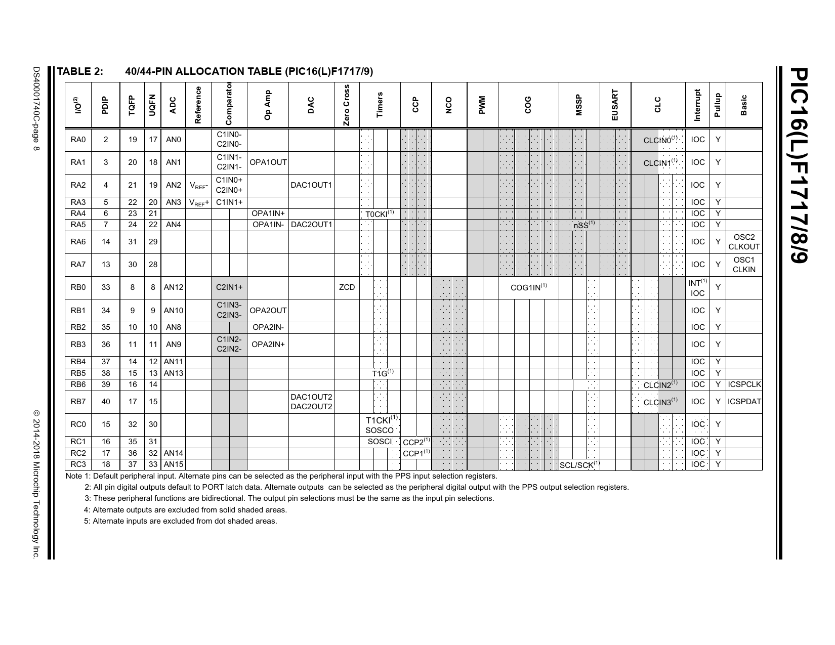 PIC16(L)F1717/8/9. TABLE 2:. 40/44-PIN ALLOCATION TABLE (PIC16(L)F1717/9). DIP. rrupt. SSP. asi. I/O. imer. CCP. CLC. ullup. ADC. DAC. NCO. efer