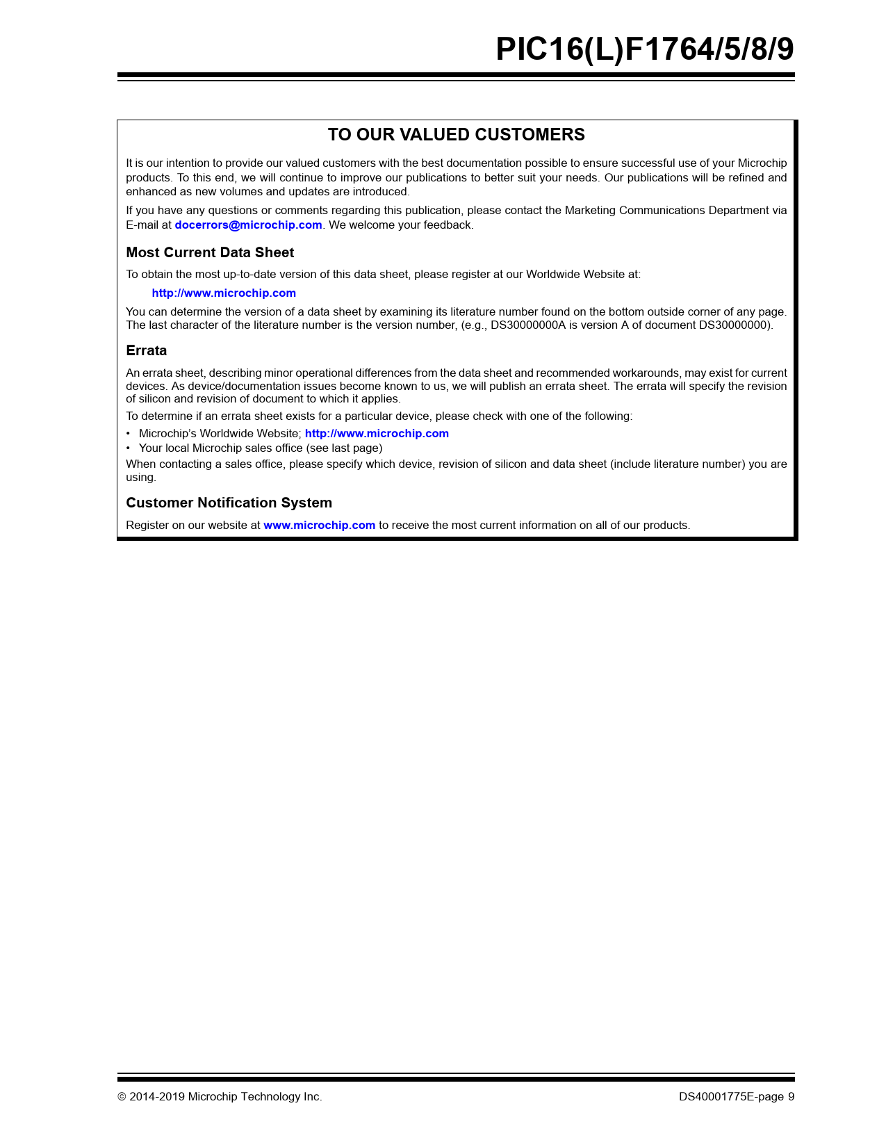 PIC16(L)F1764/5/8/9. TO OUR VALUED CUSTOMERS. docerrors@microchip.com. Most Current Data Sheet. http://www.microchip.com. Errata