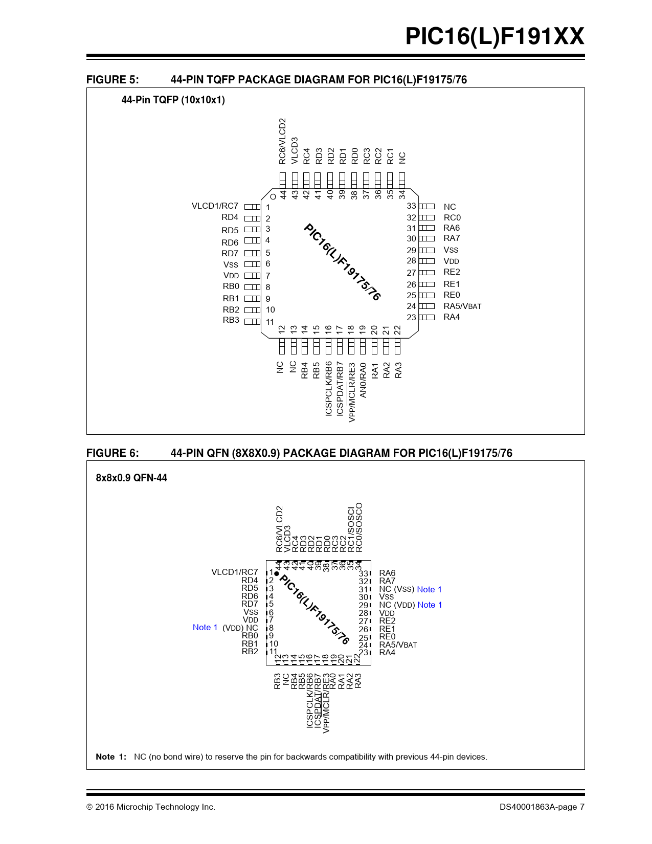 NC (no bond wire) to reserve the pin for backwards compatibility with previous 44-pin devices. 2016 Microchip Technology Inc. DS40001863A-page 7 Document Outline Description: Core Features: Memory: Operating Characteristics: Power-Saving Functionality: eXtreme Low-Power (XLP) Features: Digital Peripherals: Analog Peripherals: Flexible Oscillator Structure: TABLE 1: PIC16(L)F191XX Family Types TABLE 2: Packages Pin Diagrams FIGURE 1: 28-Pin SSOP, SPDIP and SOIC package Diagram for PIC16(L)F19155/56 FIGURE 2: 28-Pin UQFN Package Diagram For PIC16(L)F19155/56 FIGURE 3: 40-Pin PDIP Package Diagram For PIC16(L)F19175/76 FIGURE 4: 40-Pin UQFN (5x5X0.5) Package Diagram For PIC16(L)F19175/76 FIGURE 5: 44-Pin TQFP package Diagram for PIC16(L)F19175/76 FIGURE 6: 44-Pin QFN (8x8X0.9) Package Diagram For PIC16(L)F19175/76 FIGURE 7: 48-Pin TQFP/UQFN package Diagram for PIC16(L)F19185/86 FIGURE 8: 64-Pin TQFP/QFN package Diagram for PIC16(L)F19195/96/97 TABLE 3: 28-Pin Allocation Table (PIC16(L)F19155/56) TABLE 4: 40/44-Pin Allocation Table (PIC16(L)F19175/76) TABLE 5: 48-Pin Allocation Table (PIC16(L)F19185/86) TABLE 6: 64-Pin Allocation Table (PIC16(L)F19195/96/97) Trademarks Worldwide Sales