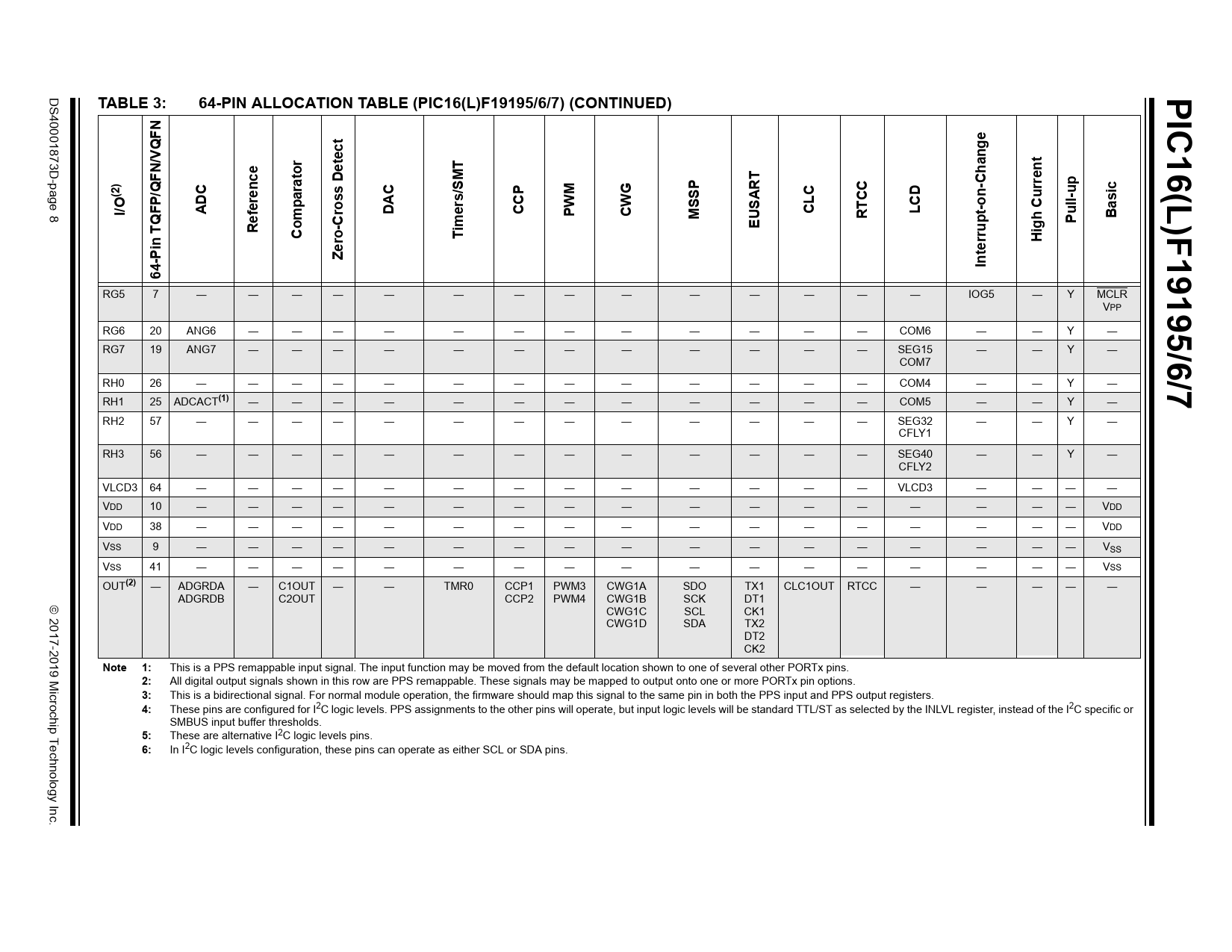| Seiten / Seite | 731 / 8 — PIC16(L)F19195/6/7. TABLE 3:. 64-PIN ALLOCATION TABLE … |