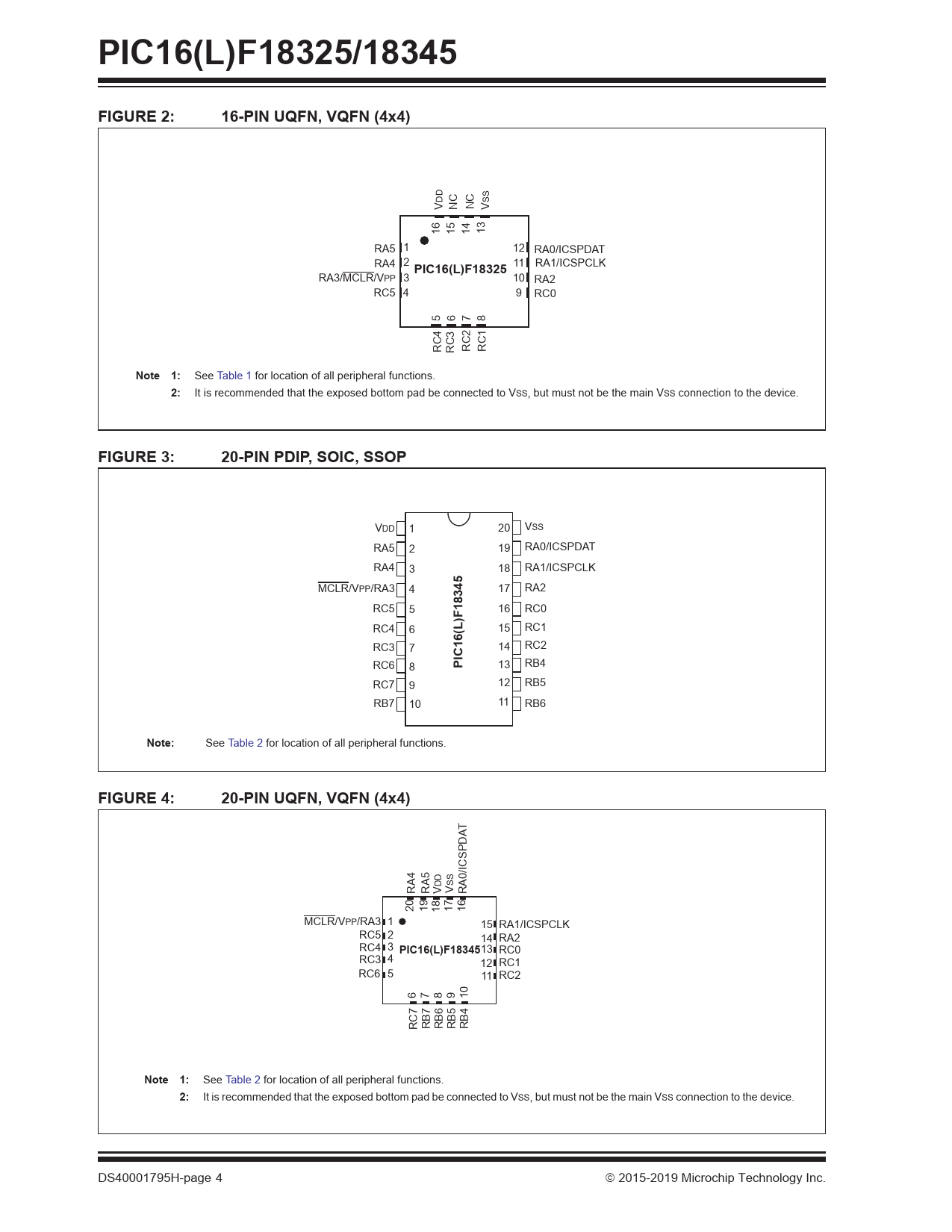 PIC16(L)F18325/18345. FIGURE 2:. 16-PIN UQFN, VQFN (4x4). PIC16(L)F18325. Note 1:. FIGURE 3:. 20-PIN PDIP, SOIC, SSOP. PIC16(L)F18345