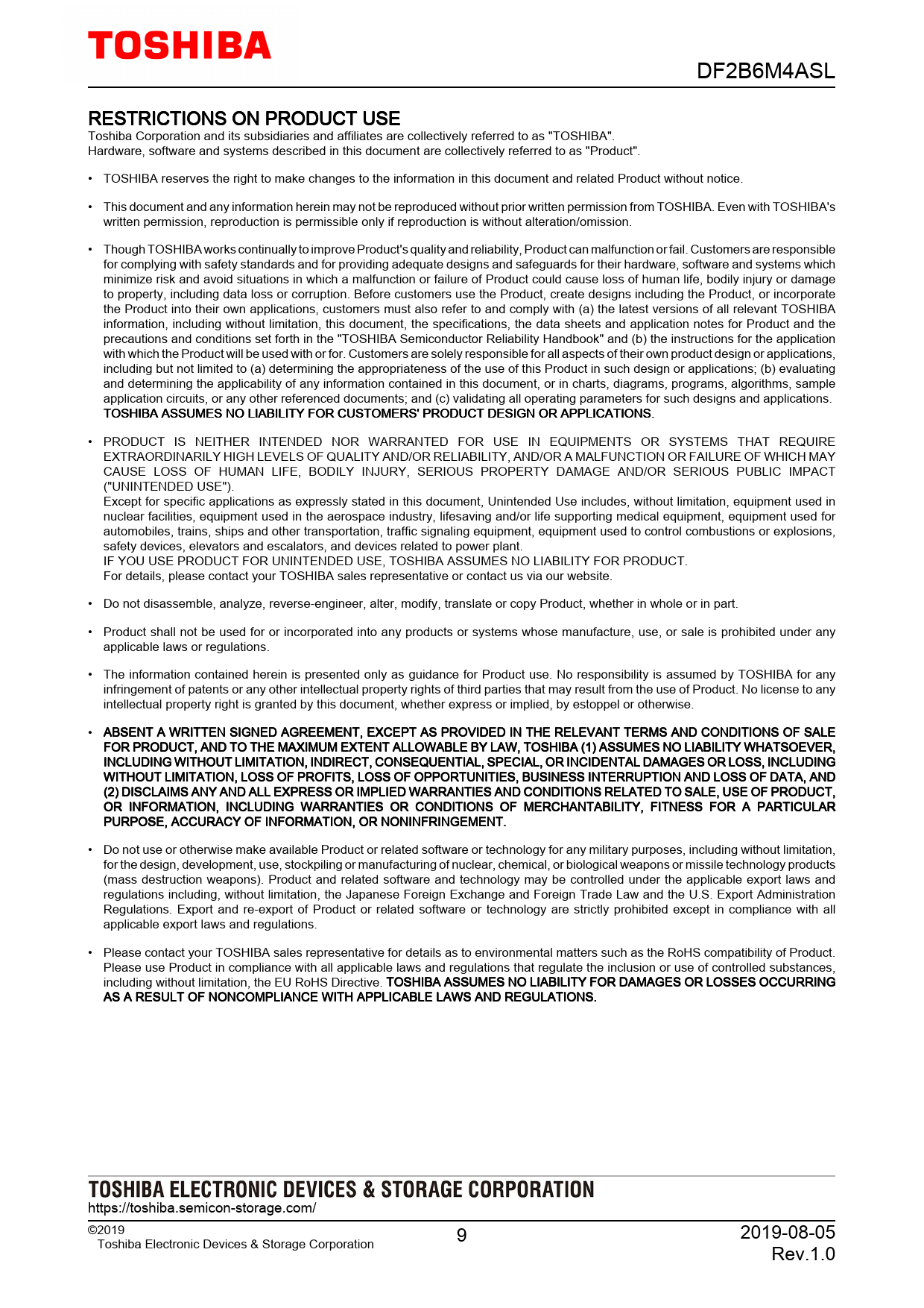 DF2B6M4ASL RESTRICTIONS ON PRODUCT USE Toshiba Corporation and its subsidiaries and affiliates are collectively referred to as "TOSHIBA". Hardware, software and systems described in this document are collectively referred to as "Product". • TOSHIBA reserves the right to make changes to the information in this document and related Product without notice. • This document and any information herein may not be reproduced without prior written permission from TOSHIBA. Even with TOSHIBA's written permission, reproduction is permissible only if reproduction is without alteration/omission. • Though TOSHIBA works continually to improve Product's quality and reliability, Product can malfunction or fail. Customers are responsible for complying with safety standards and for providing adequate designs and safeguards for their hardware, software and systems which minimize risk and avoid situations in which a malfunction or failure of Product could cause loss of human life, bodily injury or damage to property, including data loss or corruption. Before customers use the Product, create designs including the Product, or incorporate the Product into their own applications, customers must also refer to and comply with (a) the latest versions of all relevant TOSHIBA information, including without limitation, this document, the specifications, the data sheets and application notes for Product and the precautions and conditions set forth in the "TOSHIBA Semiconductor Reliability Handbook" and (b) the instructions for the application with which the Product will be used with or for. Customers are solely responsible for all aspects of their own product design or applications, including but not limited to (a) determining the appropriateness of the use of this Product in such design or applications; (b) evaluating and determining the applicability of any information contained in this document, or in charts, diagrams, programs, algorithms, sample application circuits, or any other referenced documents; and (c) validating all operating parameters for such designs and applications. TOSHIBA ASSUMES NO LIABILITY FOR CUSTOMERS' PRODUCT DESIGN OR APPLICATIONS. • PRODUCT IS NEITHER INTENDED NOR WARRANTED FOR USE IN EQUIPMENTS OR SYSTEMS THAT REQUIRE EXTRAORDINARILY HIGH LEVELS OF QUALITY AND/OR RELIABILITY, AND/OR A MALFUNCTION OR FAILURE OF WHICH MAY CAUSE LOSS OF HUMAN LIFE, BODILY INJURY, SERIOUS PROPERTY DAMAGE AND/OR SERIOUS PUBLIC IMPACT ("UNINTENDED USE"). Except for specific applications as expressly stated in this document, Unintended Use includes, without limitation, equipment used in nuclear facilities, equipment used in the aerospace industry, lifesaving and/or life supporting medical equipment, equipment used for automobiles, trains, ships and other transportation, traffic signaling equipment, equipment used to control combustions or explosions, safety devices, elevators and escalators, and devices related to power plant. IF YOU USE PRODUCT FOR UNINTENDED USE, TOSHIBA ASSUMES NO LIABILITY FOR PRODUCT. For details, please contact your TOSHIBA sales representative or contact us via our website. • Do not disassemble, analyze, reverse-engineer, alter, modify, translate or copy Product, whether in whole or in part. • Product shall not be used for or incorporated into any products or systems whose manufacture, use, or sale is prohibited under any applicable laws or regulations. • The information contained herein is presented only as guidance for Product use. No responsibility is assumed by TOSHIBA for any infringement of patents or any other intellectual property rights of third parties that may result from the use of Product. No license to any intellectual property right is granted by this document, whether express or implied, by estoppel or otherwise. • ABSENT A ABSENT WRITTEN A SIGNED WRITTEN AGREEMENT, SIGNED EXCEPT AGREEMENT, AS EXCEPT PROVIDED AS IN PROVIDED THE IN RELEVANT THE TERMS RELEVANT AND TERMS CONDITIONS AND OF CONDITIONS SALE OF FOR PRODUCT, FOR AND PRODUCT, TO AND THE TO MAXIMUM THE EXTENT MAXIMUM ALLOWABLE EXTENT BY ALLOWABLE LAW, BY TOSHIBA LAW, (1) TOSHIBA ASSUMES (1) NO ASSUMES LIABILITY NO WHATSOEVER, LIABILITY INCLUDING WITHOUT INCLUDING LIMITATION, WITHOUT INDIRECT, LIMITATION, CONSEQUENTIAL, INDIRECT, SPECIAL, CONSEQUENTIAL, OR SPECIAL, INCIDENTAL OR DAMAGES INCIDENTAL OR DAMAGES LOSS, OR INCLUDING LOSS, WITHOUT LIMITATION, WITHOUT LOSS LIMITATION, OF LOSS PROFITS, OF LOSS PROFITS, OF LOSS OPPORTUNITIES, OF BUSINESS OPPORTUNITIES, INTERRUPTION BUSINESS AND INTERRUPTION LOSS AND OF LOSS DATA, OF AND DATA, (2) DISCLAIMS (2) ANY DISCLAIMS AND ANY ALL AND EXPRESS ALL OR EXPRESS IMPLIED OR WARRANTIES IMPLIED AND WARRANTIES CONDITIONS AND RELATED CONDITIONS TO RELATED SALE, TO USE SALE, OF USE PRODUCT, OF OR INFORMATION, INCLUDING WARRANTIES OR CONDITIONS OF MERCHANTABILITY, FITNESS FOR A PARTICULAR PURPOSE, ACCURACY OF INFORMATION, OR NONINFRINGEMENT. • Do not use or otherwise make available Product or related software or technology for any military purposes, including without limitation, for the design, development, use, stockpiling or manufacturing of nuclear, chemical, or biological weapons or missile technology products (mass destruction weapons). Product and related software and technology may be controlled under the applicable export laws and regulations including, without limitation, the Japanese Foreign Exchange and Foreign Trade Law and the U.S. Export Administration Regulations. Export and re-export of Product or related software or technology are strictly prohibited except in compliance with all applicable export laws and regulations. • Please contact your TOSHIBA sales representative for details as to environmental matters such as the RoHS compatibility of Product. Please use Product in compliance with all applicable laws and regulations that regulate the inclusion or use of controlled substances, including without limitation, the EU RoHS Directive. TOSHIBA ASSUME