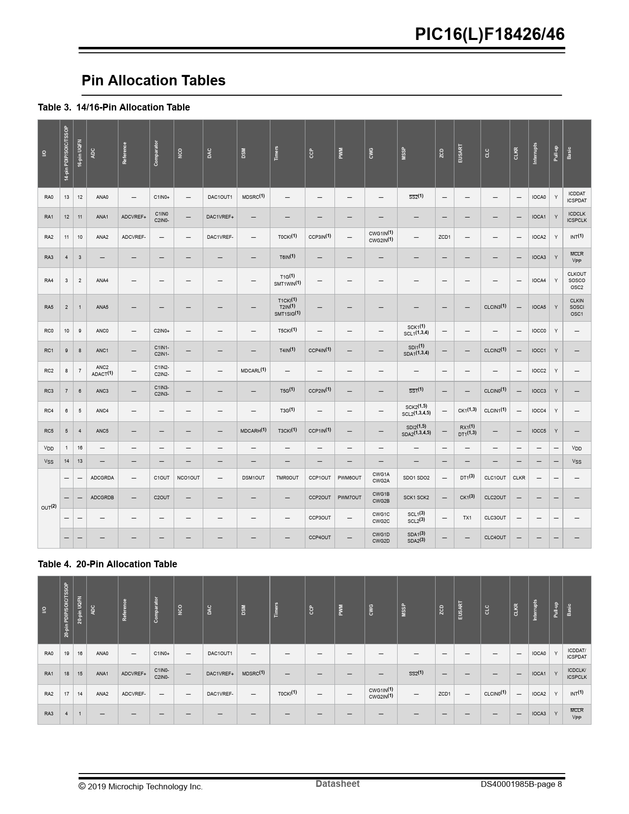 PIC16(L)F18426/46. Pin Allocation Tables. Table 3. 14/16-Pin Allocation Table. I/O. ADC. NCO. DAC. DSM. imers. CCP. CLC. PWM. CWG. MSSP. ZCD. CLKR
