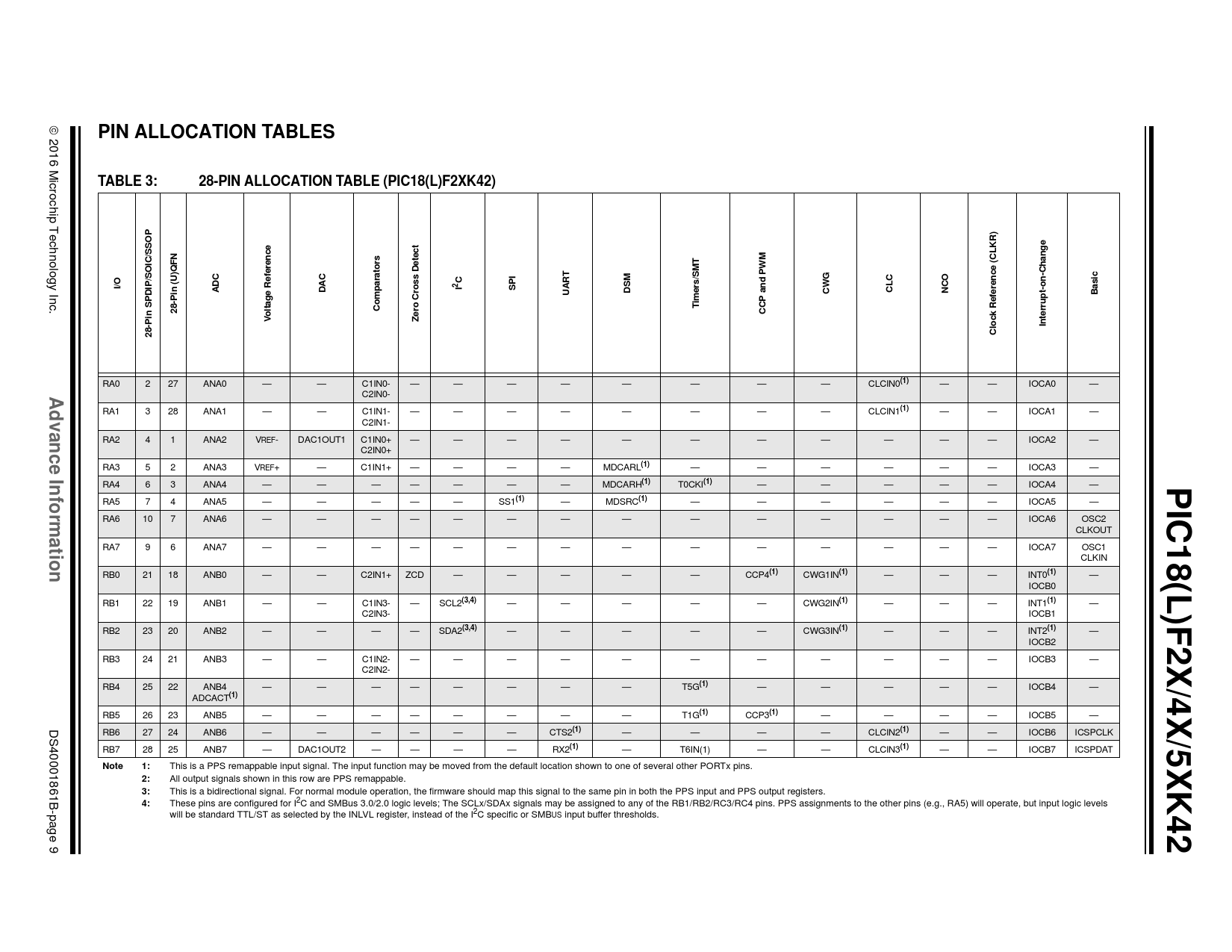 PIN ALLOCATION TABLES. TABLE 3:. 28-PIN ALLOCATION TABLE (PIC18(L)F2XK42). ) R. /SSO. n-C. I/O. a p. 2 I. SPI. asic. e R. ros. DSM. NCO. t-o. SPD. ltag
