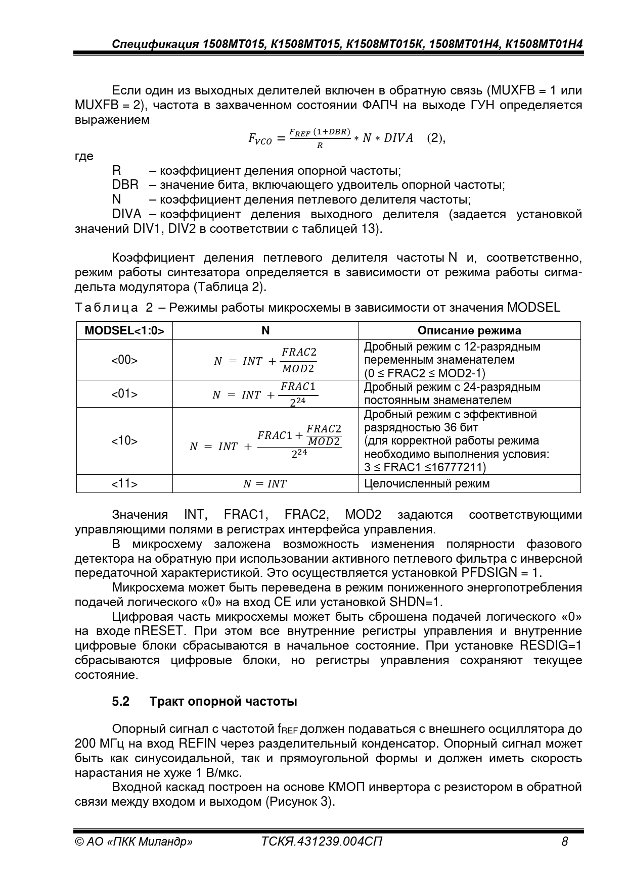 Спецификация 1508МТ015, К1508МТ015, К1508МТ015К, 1508МТ01Н4, К1508МТ01Н4. MODSEL<1:0>. Описание режима. 5.2