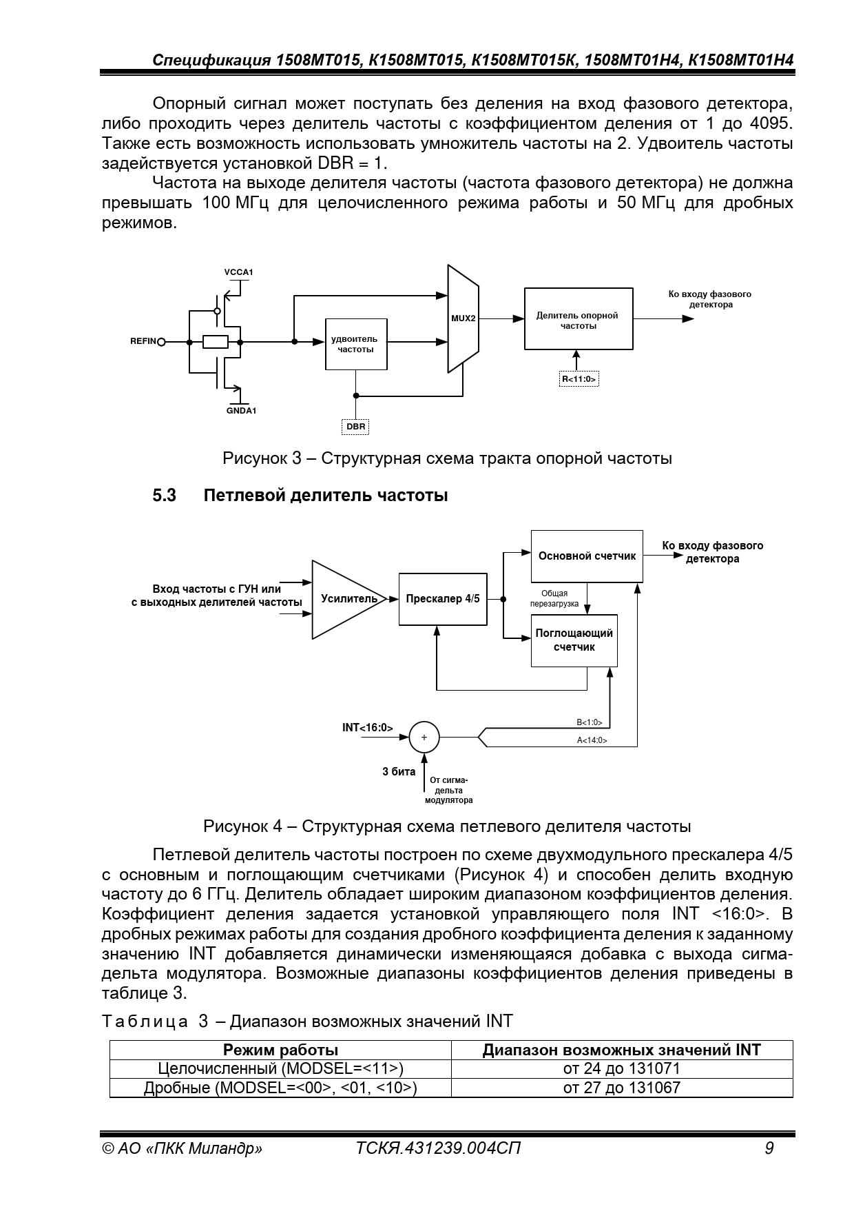 Целочисленный (MODSEL=<11>) от 24 до 131071 Дробные (MODSEL=<00>, <01, <10>) от 27 до 131067 © АО «ПКК Миландр» ТСКЯ.431239.004CП 9 Document Outline 1 Структурная блок-схема микросхемы 2 Условное графическое обозначение 3 Описание выводов 4 Указания по применению и эксплуатации 5 Описание функционирования микросхемы 5.1 Общее описание микросхемы 5.2 Тракт опорной частоты 5.3 Петлевой делитель частоты 5.4 Фазовый детектор и зарядно-разрядный блок 5.4.1 Ток смещения ЗРБ 5.5 Генератор, управляемый напряжением 5.6 Система автоматической установки диапазона ГУН 5.7 Работа в режиме с отключенной автокалибровкой и непосредственной установкой рабочего диапазона ГУН 5.8 Выходные делители частоты, выходы RF, CMOS, LVDS 5.9 Детектор захвата частоты 5.10 Универсальный выход MUXOUT 5.11 Функция быстрого захвата частоты (Fast Lock) 5.12 Функция предотвращения «проскальзывания» циклов (CSR – Cycle Slip Reduction) 5.13 Отключение буферов выходного сигнала 5.14 Фазовый шум и паразитные составляющие спектра выходного сигнала в дробных режимах работы 5.15 Функция управления фазой выходного сигнала 5.16 Ток потребления в различных режимах работы 5.17 Процедура включения и начальное состояние микросхемы 5.18 Описание протокола интерфейса программирования 5.18.1 Запись регистров управления 5.18.2 Чтение внутренних регистров состояния 5.19 Карта регистров SPI-интерфейса 6 Типовая схема включения микросхемы 7 Предельно-допустимые характеристики микросхемы 8 Электрические параметры микросхемы 9 Справочные данные 10 Основные зависимости 11 Габаритный чертеж микросхемы 12 Информация для заказа 13 Лист регистрации изменений