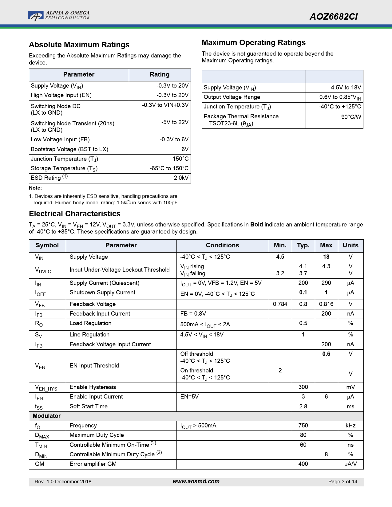 AOZ6682CIAbsolute Maximum RatingsMaximum Operating Ratings Exceeding the Absolute Maximum Ratings may damage the The device is not guaranteed to operate beyond the device. Maximum Operating ratings. ParameterRating Supply Voltage (VIN) -0.3V to 20V Supply Voltage (VIN) 4.5V to 18V High Voltage Input (EN) -0.3V to 20V Output Voltage Range 0.6V to 0.85*VIN Switching Node DC -0.3V to VIN+0.3V Junction Temperature (TJ) -40°C to +125°C (LX to GND) Package Thermal Resistance 90°C/W Switching Node Transient (20ns) -5V to 22V TSOT23-6L (θJA) (LX to GND) Low Voltage Input (FB) -0.3V to 6V Bootstrap Voltage (BST to LX) 6V Junction Temperature (TJ) 150°C Storage Temperature (TS) -65°C to 150°C ESD Rating (1) 2.0kV Note: 1. Devices are inherently ESD sensitive, handling precautions are required. Human body model rating: 1.5k in series with 100pF. Electrical Characteristics TA = 25°C, VIN = VEN = 12V, VOUT = 3.3V, unless otherwise specified. Specifications in Bold indicate an ambient temperature range of -40°C to +85°C. These specifications are guaranteed by design. SymbolParameterConditionsMin.Typ.MaxUnits VIN Supply Voltage -40°C < TJ < 125°C 4.518 V V 4.1 4.3 V V IN rising UVLO Input Under-Voltage Lockout Threshold VIN falling 3.2 3.7 V IIN Supply Current (Quiescent) IOUT = 0V, VFB = 1.2V, EN = 5V 200 290 A IOFF Shutdown Supply Current EN = 0V, -40°C < TJ < 125°C 0.11 A VFB Feedback Voltage 0.784 0.8 0.816 V IFB Feedback Input Current FB = 0.8V 200 nA RO Load Regulation 500mA < IOUT < 2A 0.5 % SV Line Regulation 4.5V < VIN < 18V 1 % IFB Feedback Voltage Input Current 200 nA Off threshold 0.6 V -40°C < T V J < 125°C EN EN Input Threshold On threshold 2 V -40°C < TJ < 125°C VEN_HYS Enable Hysteresis 300 mV IEN Enable Input Current EN=5V 3 6 A tSS Soft Start Time 2.8 ms Modulator fO Frequency IOUT > 500mA 750 kHz DMAX Maximum Duty Cycle 80 % TMIN Controllable Minimum On-Time (2) 60 ns DMIN Controllable Minimum Duty Cycle (2) 8 % GM Error amplifier GM 400 µA/V Rev. 1.0 December 2018 www.aosmd.com Page 3 of 14