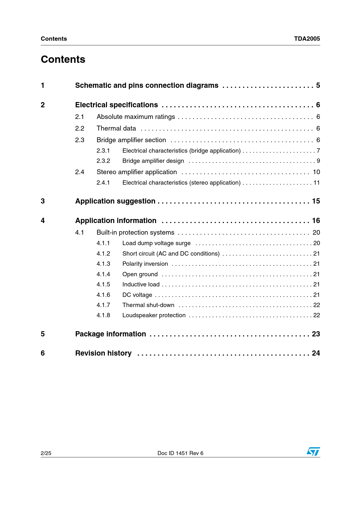 Seiten / Seite25 / 2 — Contents. TDA2005. Schematic and pins connection diagrams . 5. Electrical …