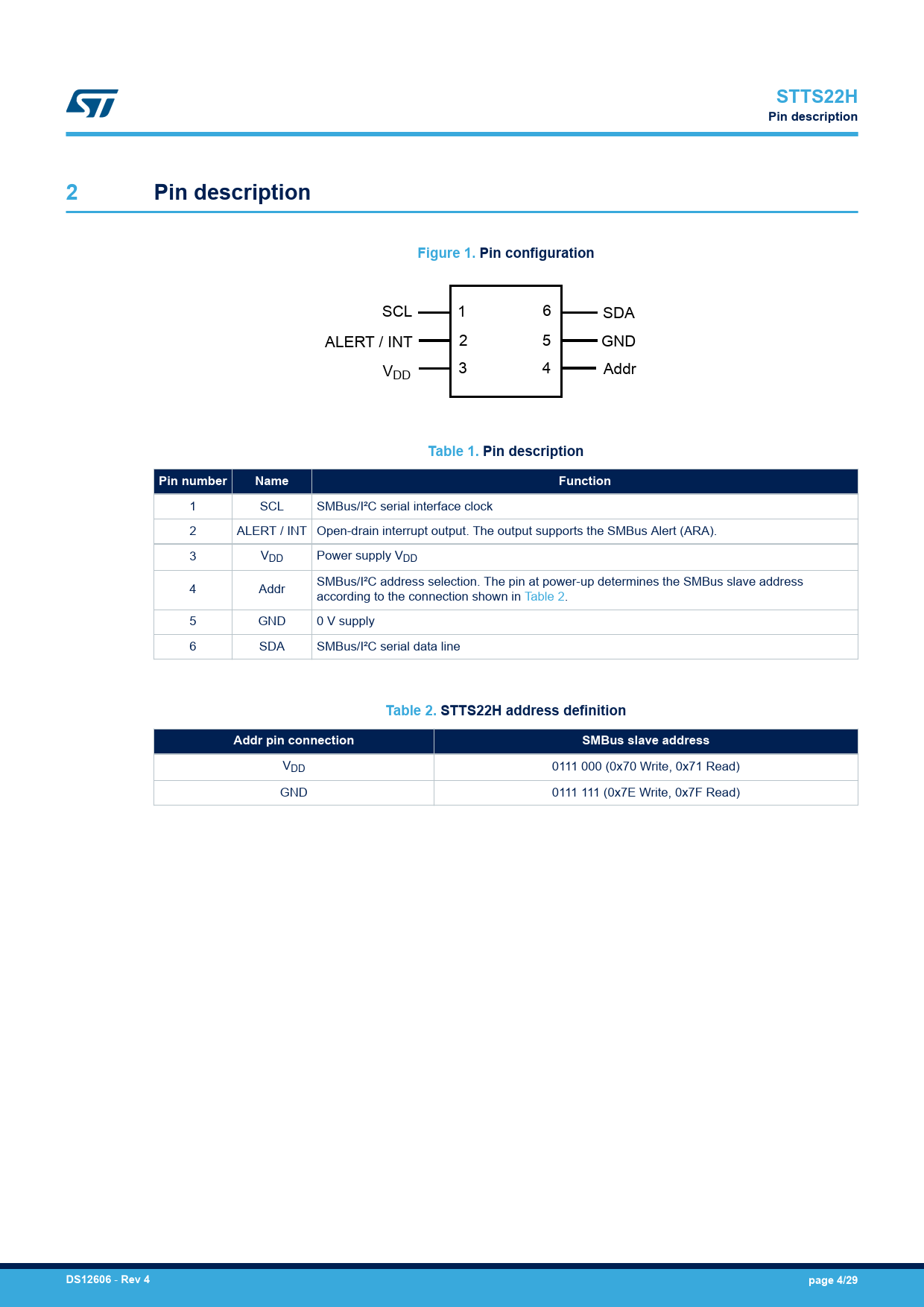 | Seiten / Seite | 29 / 4 — STTS22H. Pin description. Figure 1. Pin configuration. Table 1. Pin … |