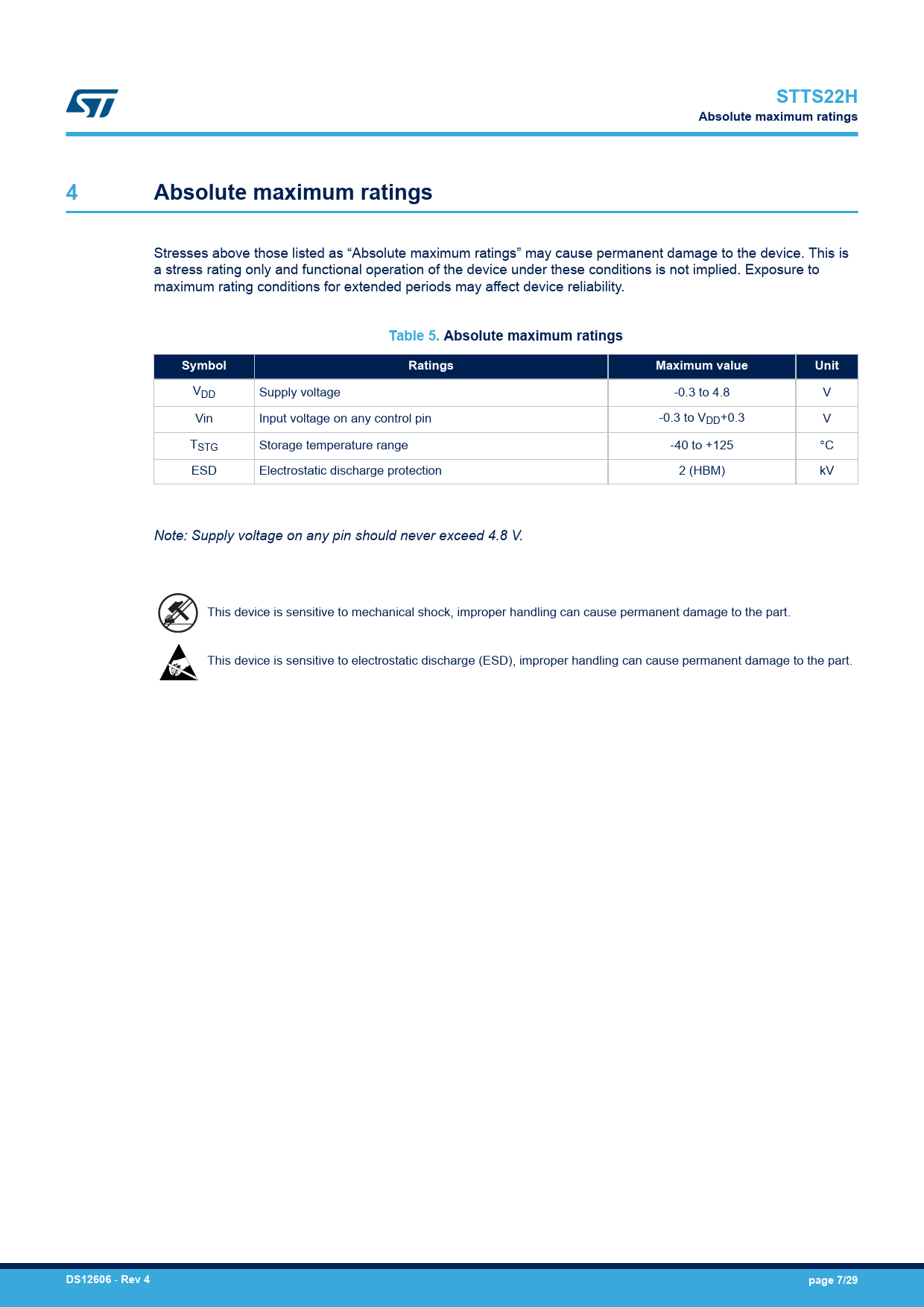 Seiten / Seite29 / 7 — STTS22H. Absolute maximum ratings. Table 5. Absolute maximum ratings. …