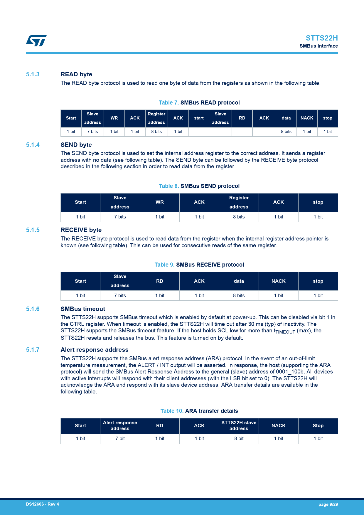 Seiten / Seite29 / 9 — STTS22H. SMBus interface. 5.1.3. READ byte. Table 7. SMBus READ protocol. …