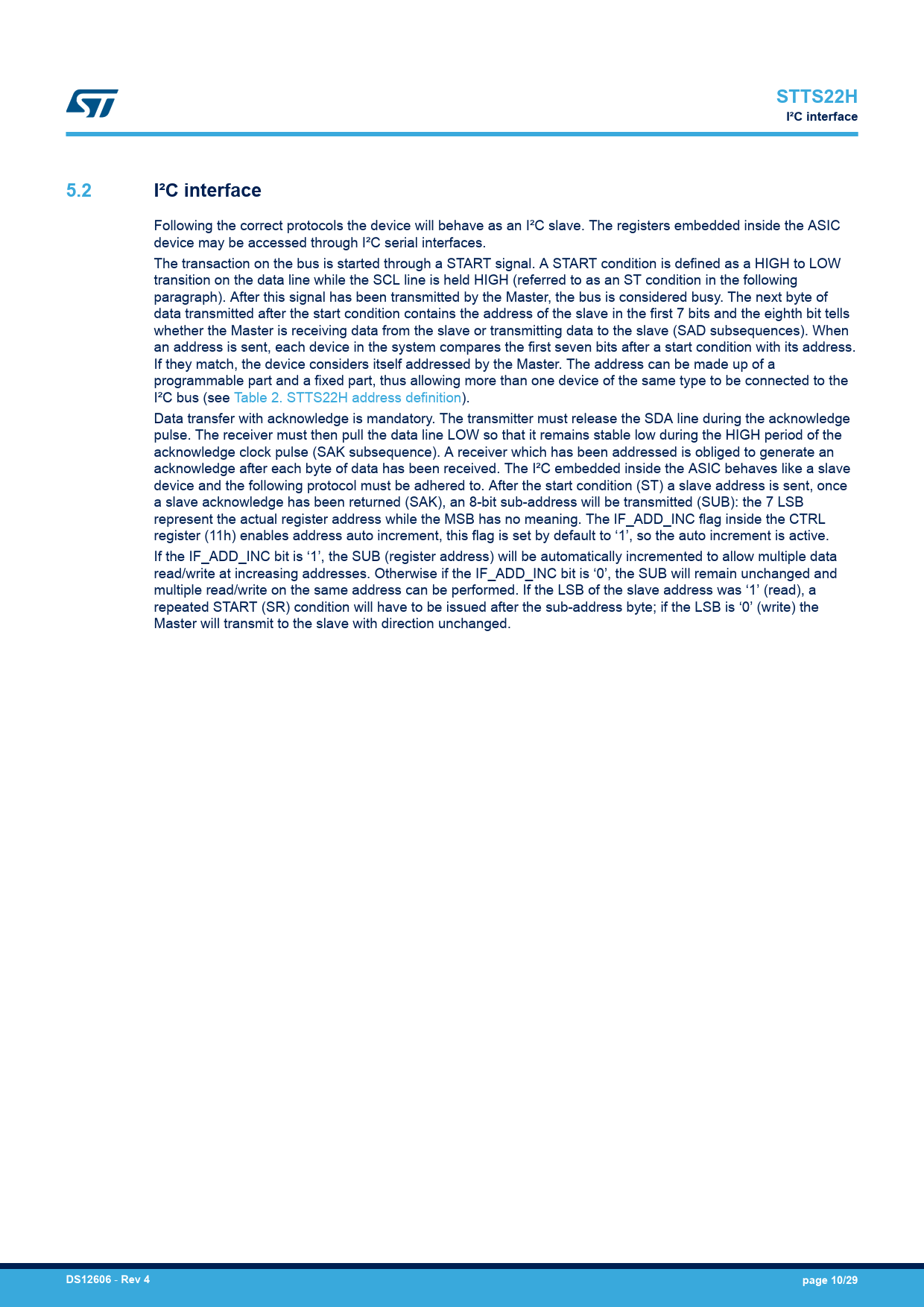 link to page 4 STTS22HI²C interface5.2I²C interface Following the correct protocols the device will behave as an I²C slave. The registers embedded inside the ASIC device may be accessed through I²C serial interfaces. The transaction on the bus is started through a START signal. A START condition is defined as a HIGH to LOW transition on the data line while the SCL line is held HIGH (referred to as an ST condition in the following paragraph). After this signal has been transmitted by the Master, the bus is considered busy. The next byte of data transmitted after the start condition contains the address of the slave in the first 7 bits and the eighth bit tells whether the Master is receiving data from the slave or transmitting data to the slave (SAD subsequences). When an address is sent, each device in the system compares the first seven bits after a start condition with its address. If they match, the device considers itself addressed by the Master. The address can be made up of a programmable part and a fixed part, thus allowing more than one device of the same type to be connected to the I²C bus (see Table 2. STTS22H address definition). Data transfer with acknowledge is mandatory. The transmitter must release the SDA line during the acknowledge pulse. The receiver must then pull the data line LOW so that it remains stable low during the HIGH period of the acknowledge clock pulse (SAK subsequence). A receiver which has been addressed is obliged to generate an acknowledge after each byte of data has been received. The I²C embedded inside the ASIC behaves like a slave device and the following protocol must be adhered to. After the start condition (ST) a slave address is sent, once a slave acknowledge has been returned (SAK), an 8-bit sub-address will be transmitted (SUB): the 7 LSB represent the actual register address while the MSB has no meaning. The IF_ADD_INC flag inside the CTRL register (11h) enables address auto increment, this flag is set by default to ‘1’, so the auto increment is active. If the IF_ADD_INC bit is ‘1’, the SUB (register address) will be automatically incremented to allow multiple data read/write at increasing addresses. Otherwise if the IF_ADD_INC bit is ‘0’, the SUB will remain unchanged and multiple read/write on the same address can be performed. If the LSB of the slave address was ‘1’ (read), a repeated START (SR) condition will have to be issued after the sub-address byte; if the LSB is ‘0’ (write) the Master will transmit to the slave with direction unchanged. DS12606 - Rev 4page 10/29 Document Outline 1 Overview 2 Pin description 3 Sensor parameters and electrical specifications 3.1 Sensor accuracy specifications 4 Absolute maximum ratings 5 Digital interfaces 5.1 SMBus interface 5.1.1 SMBus protocol 5.1.2 WRITE byte 5.1.3 READ byte 5.1.4 SEND byte 5.1.5 RECEIVE byte 5.1.6 SMBus timeout 5.1.7 Alert response address 5.2 I²C interface 5.2.1 I²C protocol 5.2.2 I²C read and write sequences 6 Register description 6.1 WHOAMI (01h) - RO 6.2 TEMP_H_LIMIT (02h) - RW 6.3 TEMP_L_LIMIT (03h) - RW 6.4 CTRL (04h) - RW 6.5 STATUS (05h) - RO 6.6 TEMP_L_OUT (06h) - RO 6.7 TEMP_H_OUT (07h) - RO 6.8 SOFTWARE_RESET (0Ch) - RW 7 Interrupt 8 ALERT / INT output 9 Operating modes 9.1 Enable sequence for one-shot mode 9.2 Enable sequence for freerun mode 9.3 Enable sequence for low-ODR mode 10 Package information 10.1 Soldering information 10.2 UDFN-6L package information 10.3 UDFN-6L packing information Revision history