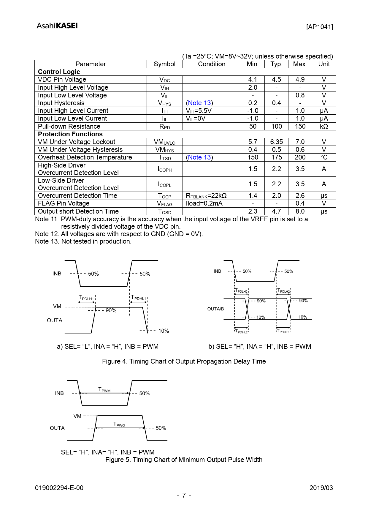 link to page 7 link to page 7 [AP1041] (Ta =25C; VM=8V~32V; unless otherwise specified) Parameter Symbol Condition Min. Typ. Max. Unit Control Logic VDC Pin Voltage VDC 4.1 4.5 4.9 V Input High Level Voltage VIH 2.0 - - V Input Low Level Voltage VIL - - 0.8 V Input Hysteresis VHYS (Note 13) 0.2 0.4 - V Input High Level Current IIH VIH=5.5V -1.0 - 1.0 μA Input Low Level Current IIL VIL=0V -1.0 - 1.0 μA Pull-down Resistance RPD 50 100 150 kΩ Protection Functions VM Under Voltage Lockout VMUVLO 5.7 6.35 7.0 V VM Under Voltage Hysteresis VMHYS 0.4 0.5 0.6 V Overheat Detection Temperature TTSD (Note 13) 150 175 200 °C High-Side Driver I 1.5 Overcurrent Detection Level 2.2 3.5 A COPH Low-Side Driver I 1.5 Overcurrent Detection Level 2.2 3.5 A COPL Overcurrent Detection Time TOCP RTBLANK=22kΩ 1.4 2.0 2.6 μs FLAG Pin Voltage VFLAG Iload=0.2mA - - 0.4 V Output short Detection Time TOSD 2.3 4.7 8.0 μs Note 11. PWM-duty accuracy is the accuracy when the input voltage of the VREF pin is set to a resistively divided voltage of the VDC pin. Note 12. All voltages are with respect to GND (GND = 0V). Note 13. Not tested in production. a) SEL= “L”, INA = “H”, INB = PWM b) SEL= “H”, INA = “H”, INB = PWM Figure 4. Timing Chart of Output Propagation Delay Time SEL= “H”, INA= “H”, INB = PWM Figure 5. Timing Chart of Minimum Output Pulse Width 019002294-E-00 2019/03 - 7 - Document Outline 1. General Description 2. Features 3. Table of Contents 4. Block Diagram 5. Pin Configulations and Functions 5.1. Pin Layout 5.2. Pin Functions 6. Absolute Maximum Ratings 7. Recommended Operation Conditions 8. Electric Characteristics 9. Functional Descriptions 9.1. Control Logic 9.2. PWM Duty Control 9.3. Protection Functions 10. Recommended External Circuit 11. Package 11.1. Outline Dimensions 11.2. Land Pattern 11.3. Marking 12. Ordering Guide 13. Revision History IMPORTANT NOTICE