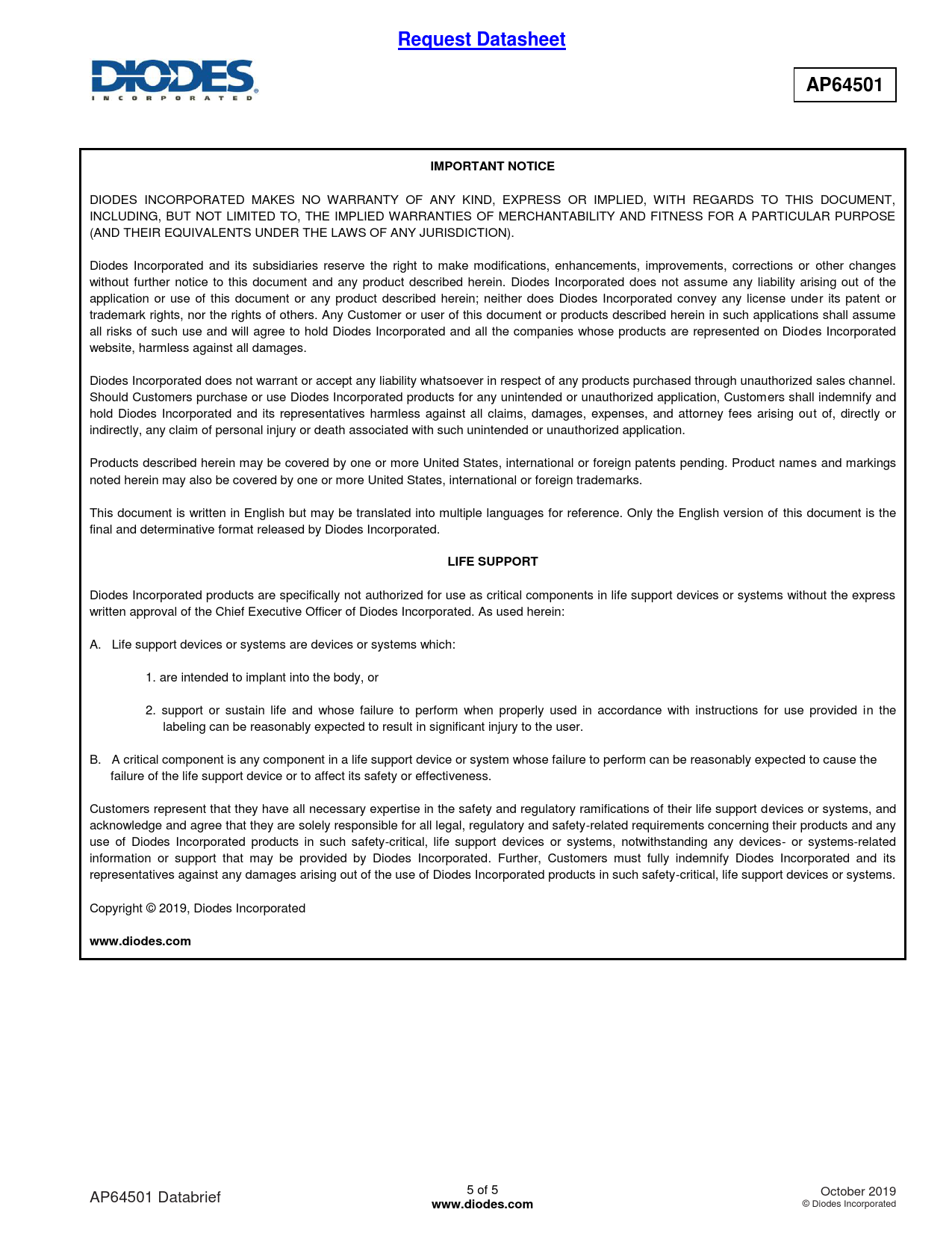 | Seiten / Seite | 5 / 5 — Request Datasheet. AP64501. IMPORTANT NOTICE. LIFE SUPPORT. www.diodes.com |