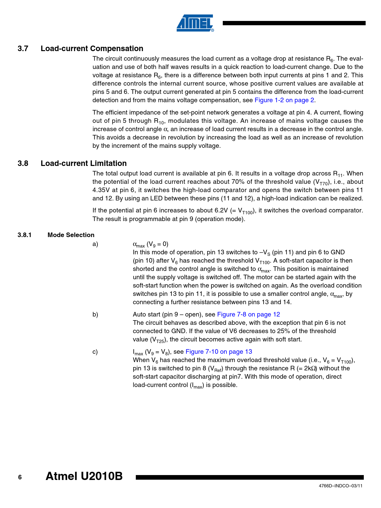 3.7 Load-current Compensation 3.8 Load-current Limitation 3.8.1 Mode Selection Atmel U2010B
