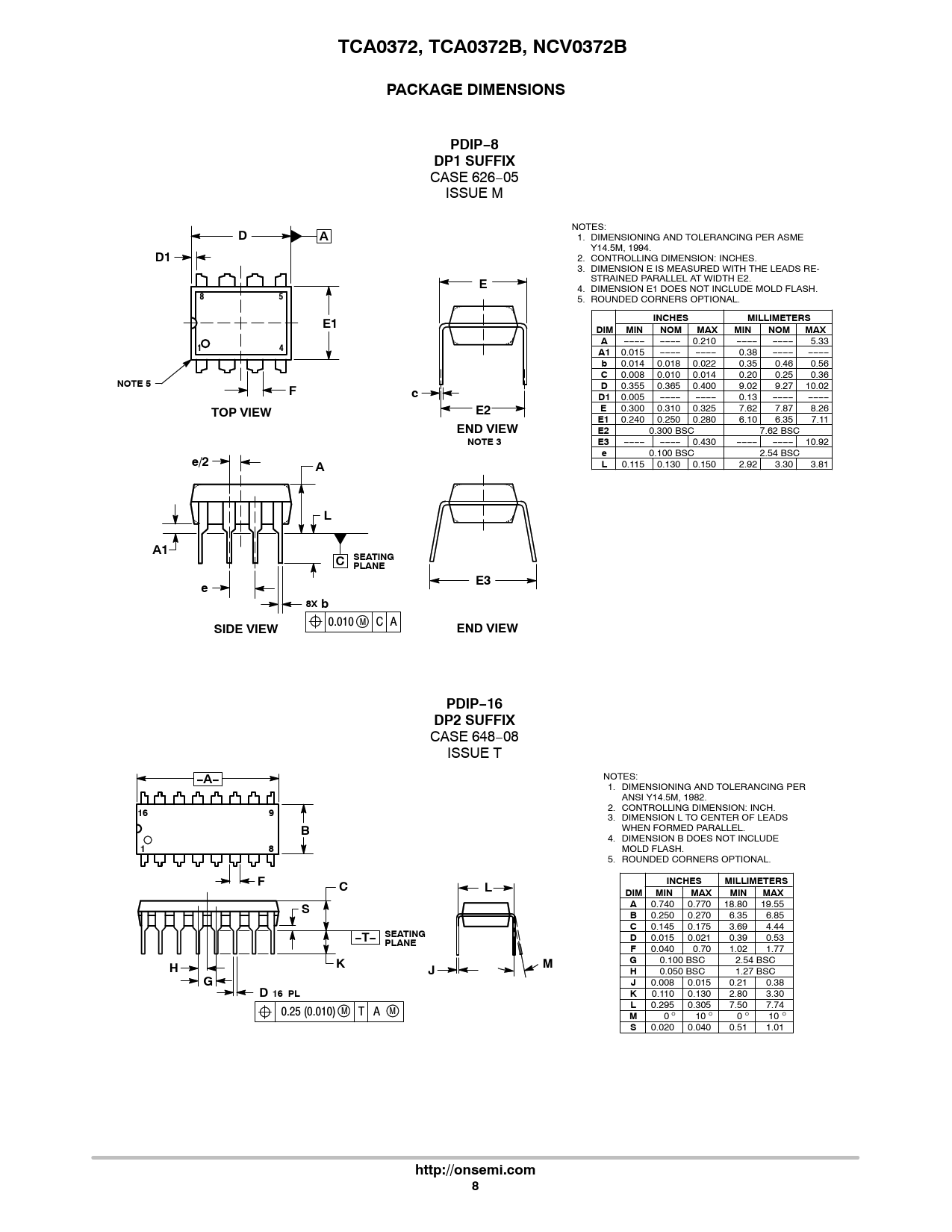 TCA0372, TCA0372B, NCV0372B. PACKAGE DIMENSIONS. PDIP−8. DP1 SUFFIX. INCHES. MILLIMETERS. DIM. MIN. NOM. MAX. NOTE 5. TOP VIEW. END VIEW. NOTE 3
