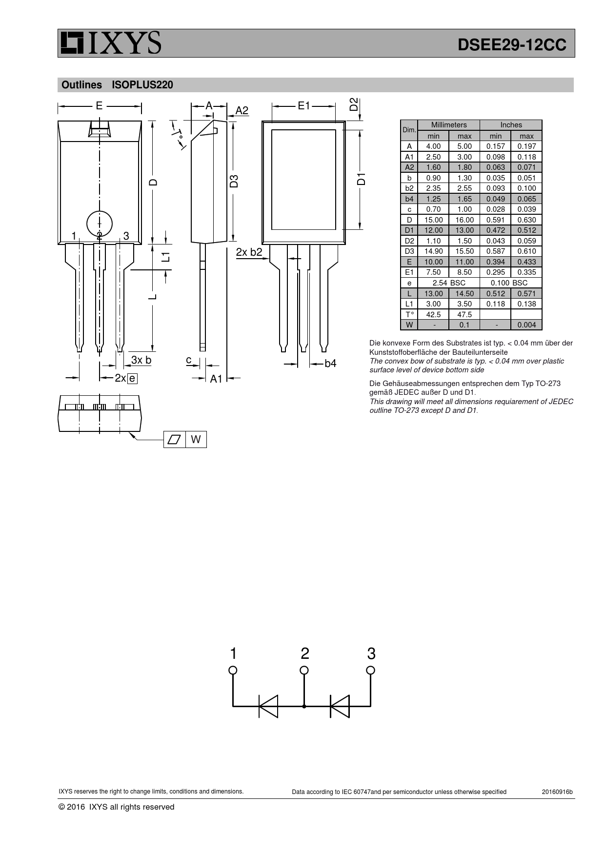 2 E A E1 A2 D T Millimeters Inches Dim. min max min max A 4.00 5.00 0.157 0.197 A1 2.50 3.00 0.098 0.118 A2 1.60 1.80 0.063 0.071 1 3 b 0.90 1.30 0.035 0.051 D D D b2 2.35 2.55 0.093 0.100 b4 1.25 1.65 0.049 0.065 c 0.70 1.00 0.028 0.039 D 15.00 16.00 0.591 0.630 D1 12.00 13.00 0.472 0.512 1 2 3 D2 1.10 1.50 0.043 0.059 1 2x b2 D3 14.90 15.50 0.587 0.610 L E 10.00 11.00 0.394 0.433 E1 7.50 8.50 0.295 0.335 e 2.54 BSC 0.100 BSC L L 13.00 14.50 0.512 0.571 L1 3.00 3.50 0.118 0.138 T° 42.5 47.5 W - 0.1 - 0.004 Die konvexe Form des Substrates ist typ. < 0.04 mm über der Kunststoffoberfläche der Bauteilunterseite 3x b c b4 The convex bow of substrate is typ. < 0.04 mm over plastic surface level of device bottom side 2x e A1 Die Gehäuseabmessungen entsprechen dem Typ TO-273 gemäß JEDEC außer D und D1. This drawing will meet all dimensions requiarement of JEDEC outline TO-273 except D and D1. W 1 2 3 IXYS reserves the right to change limits, conditions and dimensions. Data according to IEC 60747and per semiconductor unless otherwise specified 20160916b © 2016 IXYS all rights reserved