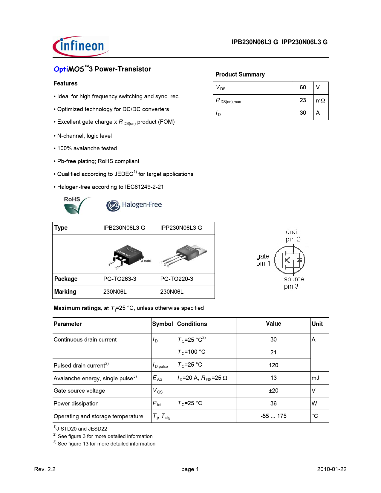 Type IPB230N06L3 G IPP230N06L3 GOptiMOS™3 Power-TransistorProduct SummaryFeatures V DS 60 V • Ideal for high frequency switching and sync. rec. R DS(on),max 23 mΩ • Optimized technology for DC/DC converters I D 30 A • Excellent gate charge x R DS(on) product (FOM) • N-channel, logic level • 100% avalanche tested • Pb-free plating; RoHS compliant • Qualified according to JEDEC1) for target applications • Halogen-free according to IEC61249-2-21 Type IPB230N06L3 G IPP230N06L3 G Package PG-TO263-3 PG-TO220-3 Marking 230N06L 230N06L Maximum ratings, at T j=25 °C, unless otherwise specified ParameterSymbol ConditionsValueUnit Continuous drain current I D T C=25 °C2) 30 A T C=100 °C 21 Pulsed drain current2) I D,pulse T C=25 °C 120 Avalanche energy, single pulse3) E AS I D=20 A, R GS=25 Ω 13 mJ Gate source voltage V GS ±20 V Power dissipation P tot T C=25 °C 36 W Operating and storage temperature T j, T stg -55 ... 175 °C 1)J-STD20 and JESD22 2) See figure 3 for more detailed information 3) See figure 13 for more detailed information Rev. 2.2 page 1 2010-01-22