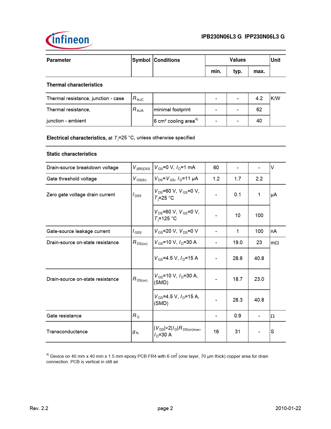IPB230N06L3 G IPP230N06L3 G. Parameter. Symbol Conditions. Values. Unit. min. typ. max. Thermal characteristics