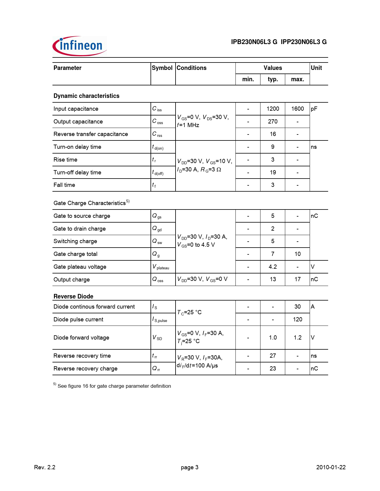 IPB230N06L3 G IPP230N06L3 G. Parameter. Symbol Conditions. Values. Unit. min. typ. max. Dynamic characteristics. Reverse Diode