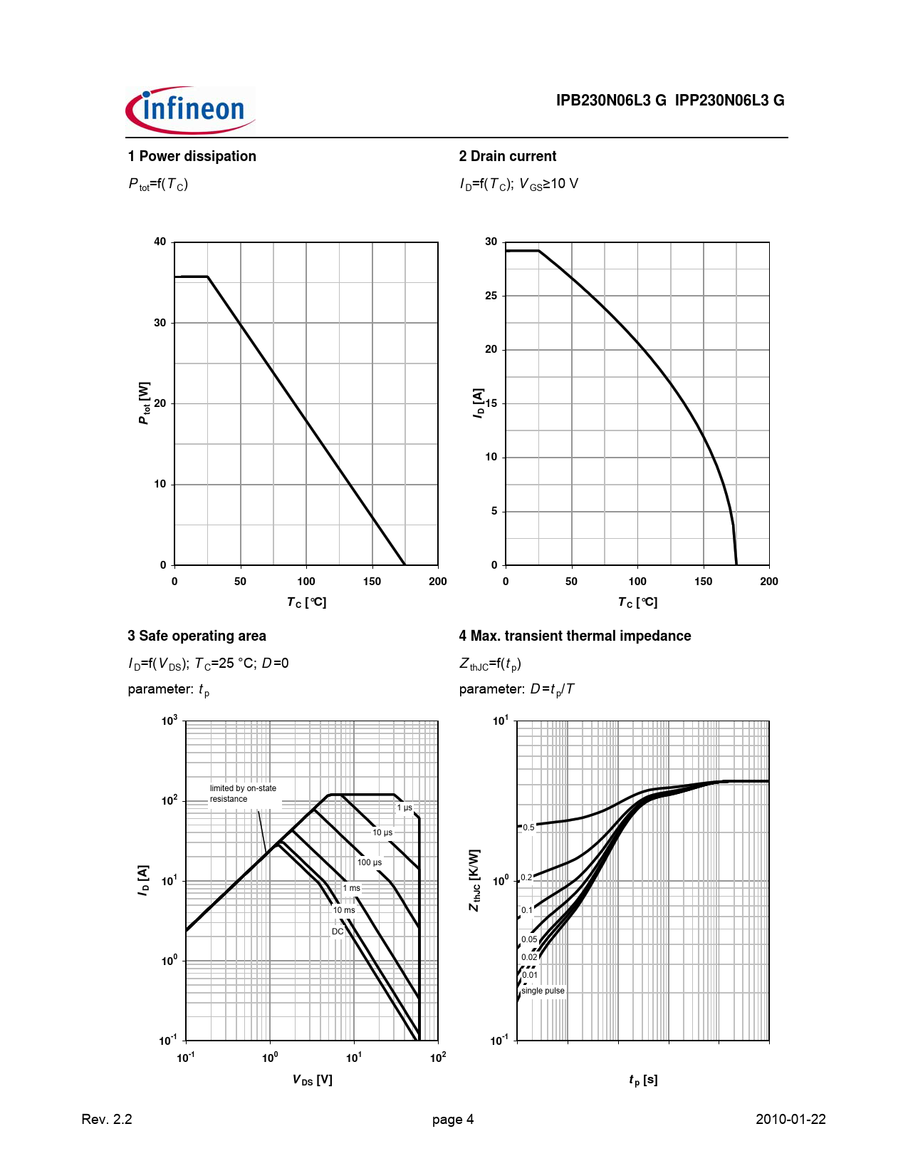 IPB230N06L3 G IPP230N06L3 G 1 Power dissipation 2 Drain current [W] 20 [A] 15 tot 100 150 200 C [°C] 3 Safe operating area