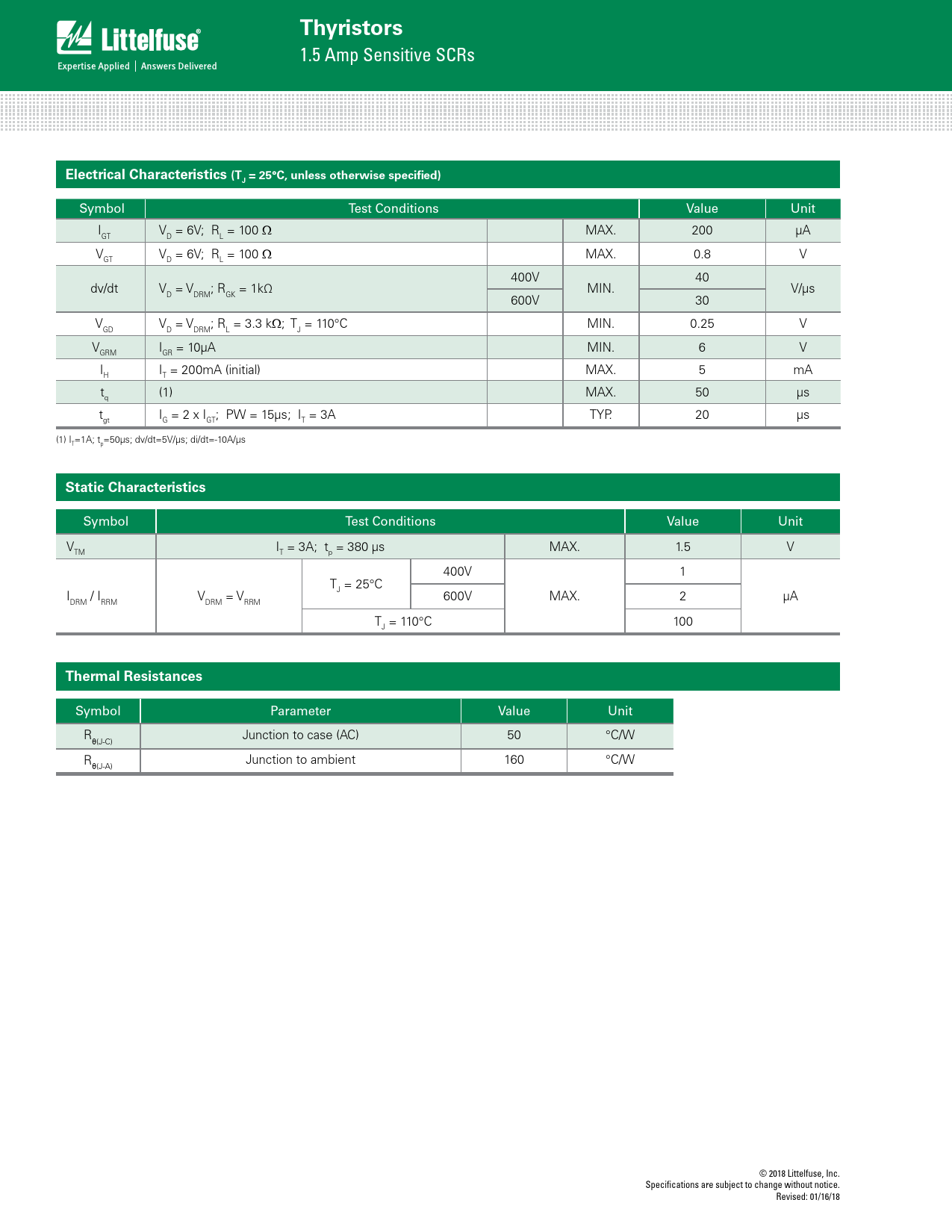 Symbol Parameter Value Unit R Junction to case (AC) 50 °C/W θ(J-C) R Junction to ambient 160 °C/W θ(J-A) © 2018 Littelfuse, Inc. Specifications are subject to change without notice. Revised: 01/16/18