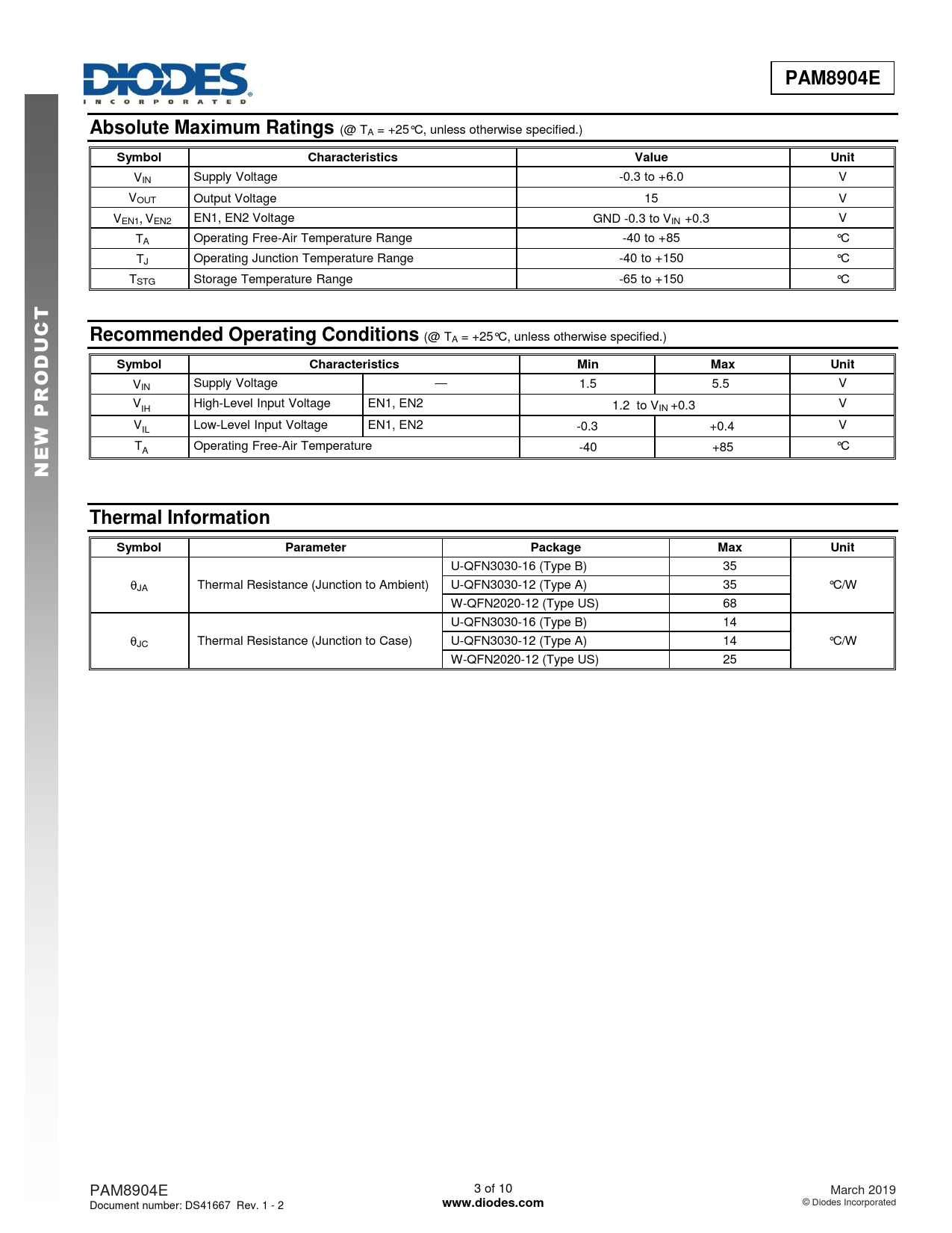 U-QFN3030-16 (Type B) 35 JA Thermal Resistance (Junction to Ambient) U-QFN3030-12 (Type A) 35 °C/W W-QFN2020-12 (Type US) 68 U-QFN3030-16 (Type B) 14 JC Thermal Resistance (Junction to Case) U-QFN3030-12 (Type A) 14 °C/W W-QFN2020-12 (Type US) 25 PAM8904E 3 of 10 March 2019 Document number: DS41667 Rev. 1 - 2