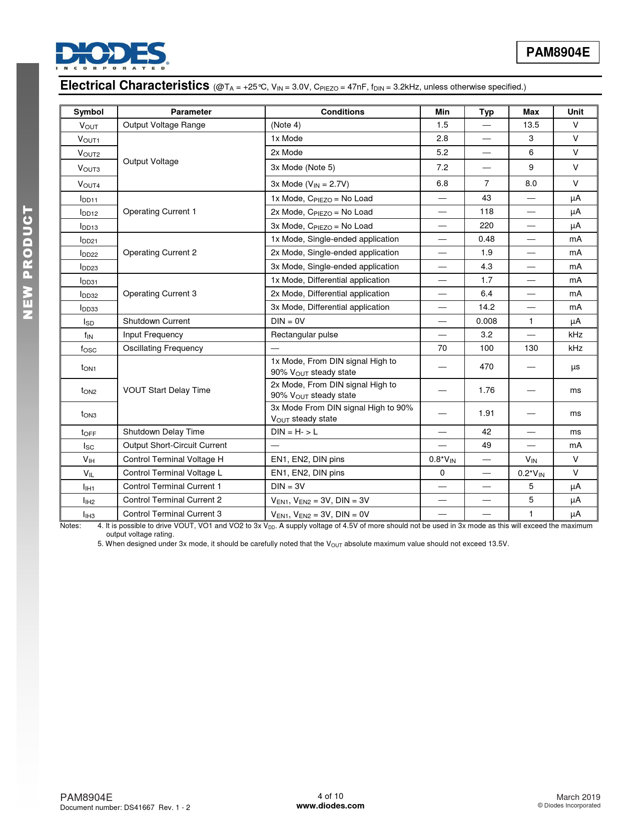 IDD33 3x Mode, Differential application — 14.2 — mA ISD Shutdown Current DIN = 0V — 0.008 1 µA fIN Input Frequency Rectangular pulse — 3.2 — kHz fOSC Oscillating Frequency — 70 100 130 kHz 1x Mode, From DIN signal High to tON1 — 470 — µs 90% VOUT steady state 2x Mode, From DIN signal High to tON2 VOUT Start Delay Time — 1.76 — ms 90% VOUT steady state 3x Mode From DIN signal High to 90% tON3 — 1.91 — ms VOUT steady state tOFF Shutdown Delay Time DIN = H- > L — 42 — ms ISC Output Short-Circuit Current — — 49 — mA VIH Control Terminal Voltage H EN1, EN2, DIN pins 0.8*VIN — VIN V VIL Control Terminal Voltage L EN1, EN2, DIN pins 0 — 0.2*VIN V IIH1 Control Terminal Current 1 DIN = 3V — — 5 µA IIH2 Control Terminal Current 2 VEN1, VEN2 = 3V, DIN = 3V — — 5 µA IIH3 Control Terminal Current 3 VEN1, VEN2 = 3V, DIN = 0V — — 1 µA Notes: 4. It is possible to drive VOUT, VO1 and VO2 to 3x VDD. A supply voltage of 4.5V of more should not be used in 3x mode as this will exceed the maximum output voltage rating. 5. When designed under 3x mode, it should be carefully noted that the VOUT absolute maximum value should not exceed 13.5V. PAM8904E 4 of 10 March 2019 Document number: DS41667 Rev. 1 - 2