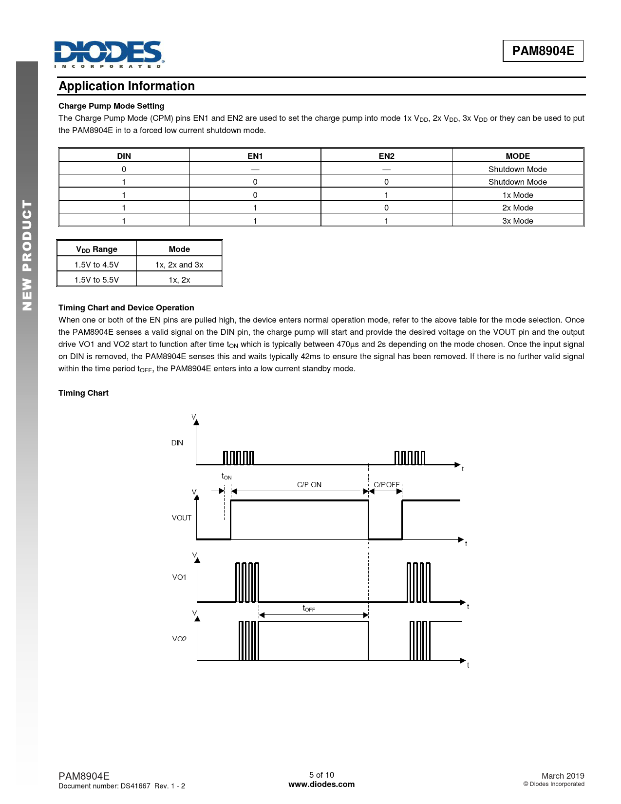 PAM8904E. Application Information. Charge Pump Mode Setting. DIN. EN1. EN2. MODE. T C. VDD Range. Mode. Timing Chart and Device Operation