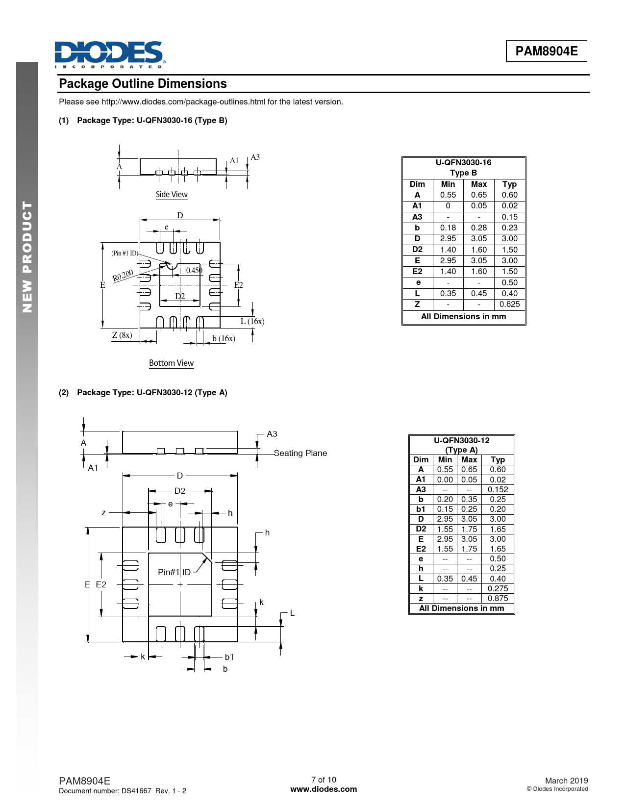 PAM8904E. Package Outline Dimensions. (1) Package Type: U-QFN3030-16 (Type B). U-QFN3030-16. Type B. Dim. Min. Max. Typ